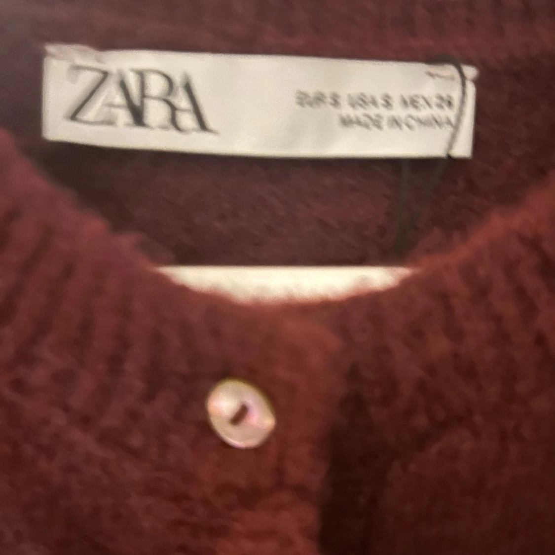 Säljer en vinröd kofta från Zara med knappar framtill. Koftan har långa ärmar och en fin volangdetalj vid nederkanten. Storlek S och nyskick