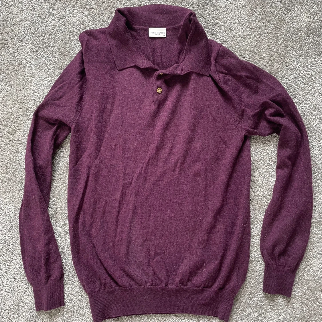 Säljer en vinröd långärmad tröja från John Henric. Tröjan har krage och en knapp framtill, samt ribbade muddar vid ärmslut och nederkant. Perfekt för lager-på-lager och stilrena outfits.
