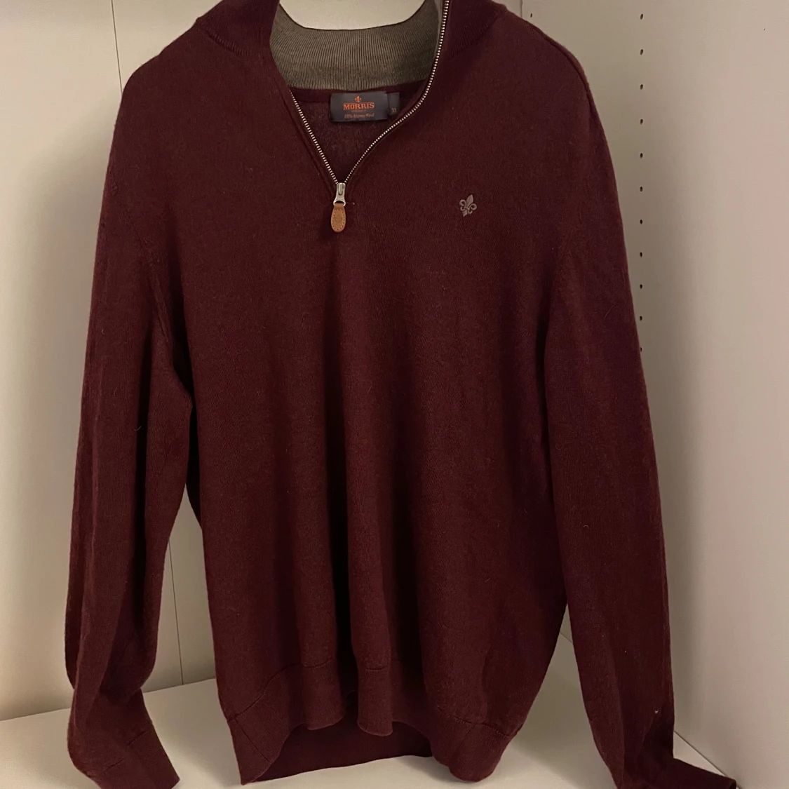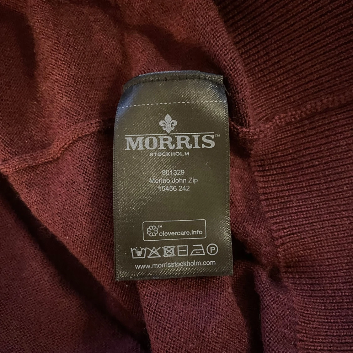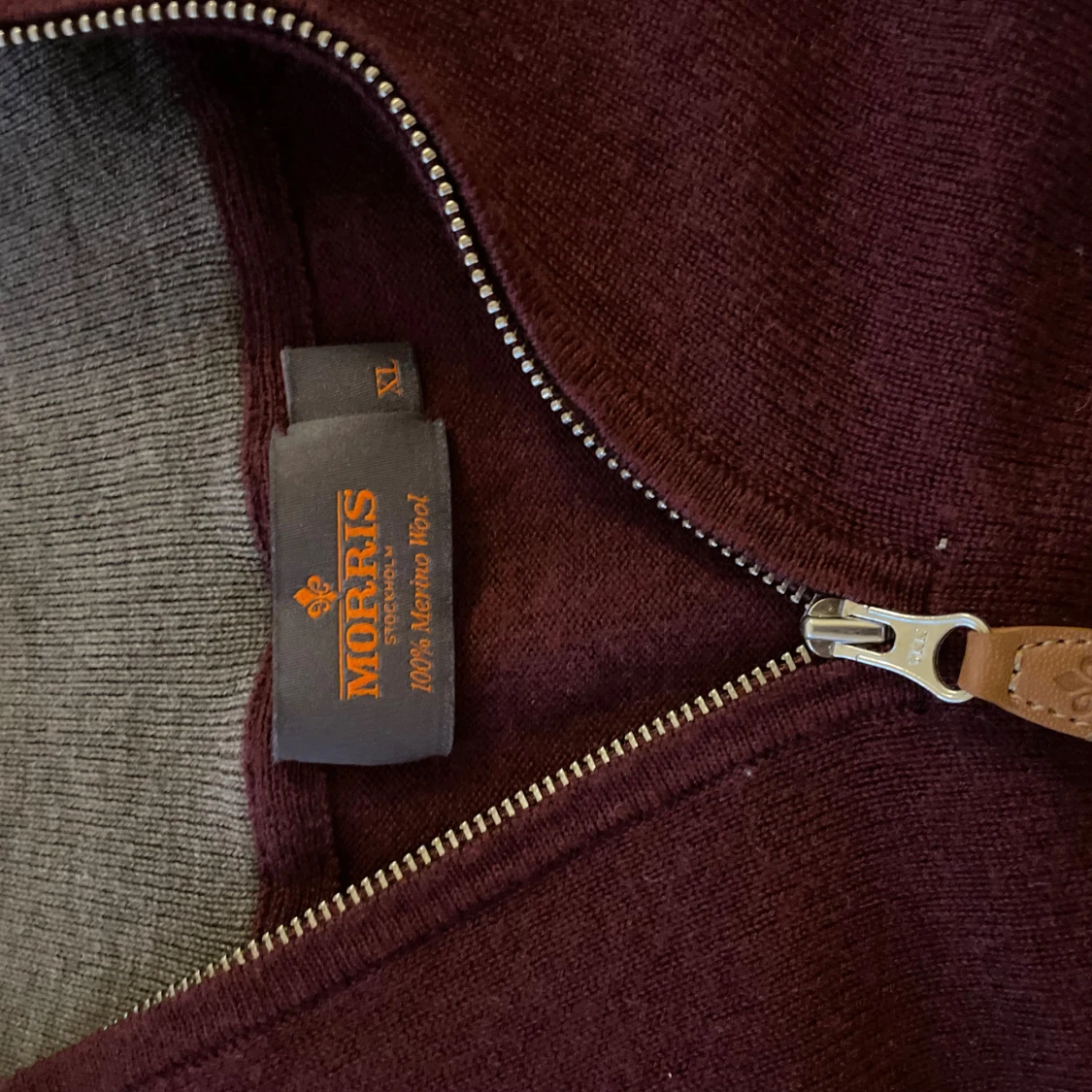 Vinröd långärmad tröja från Morris i 100% merinoull. Tröjan har en stilren half zip-dragkedja med läderdetalj och liten broderad logga på bröstet. Perfekt för dig som gillar klassisk och snygg stil med en modern touch. Står att strl är XL men den har krympt i tvätten som lett till att den är M/L i storleken. Annars är den i väldigt bra skick. Nypris 1799kr