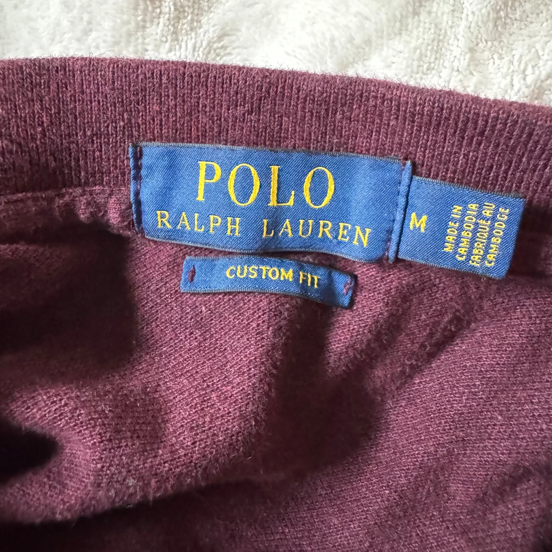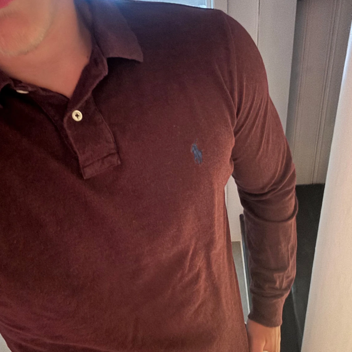 Säljer en vinröd långärmad pikétröja från Polo Ralph Lauren i custom fit. Tröjan har klassisk krage, knappar vid halsen och den ikoniska blå loggan broderad på bröstet. Perfekt för dig som gillar stilren och tidlös design.