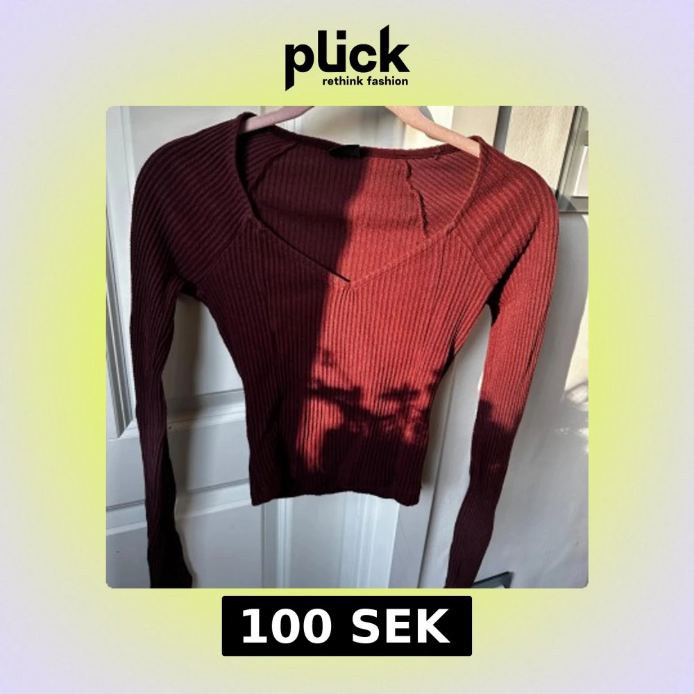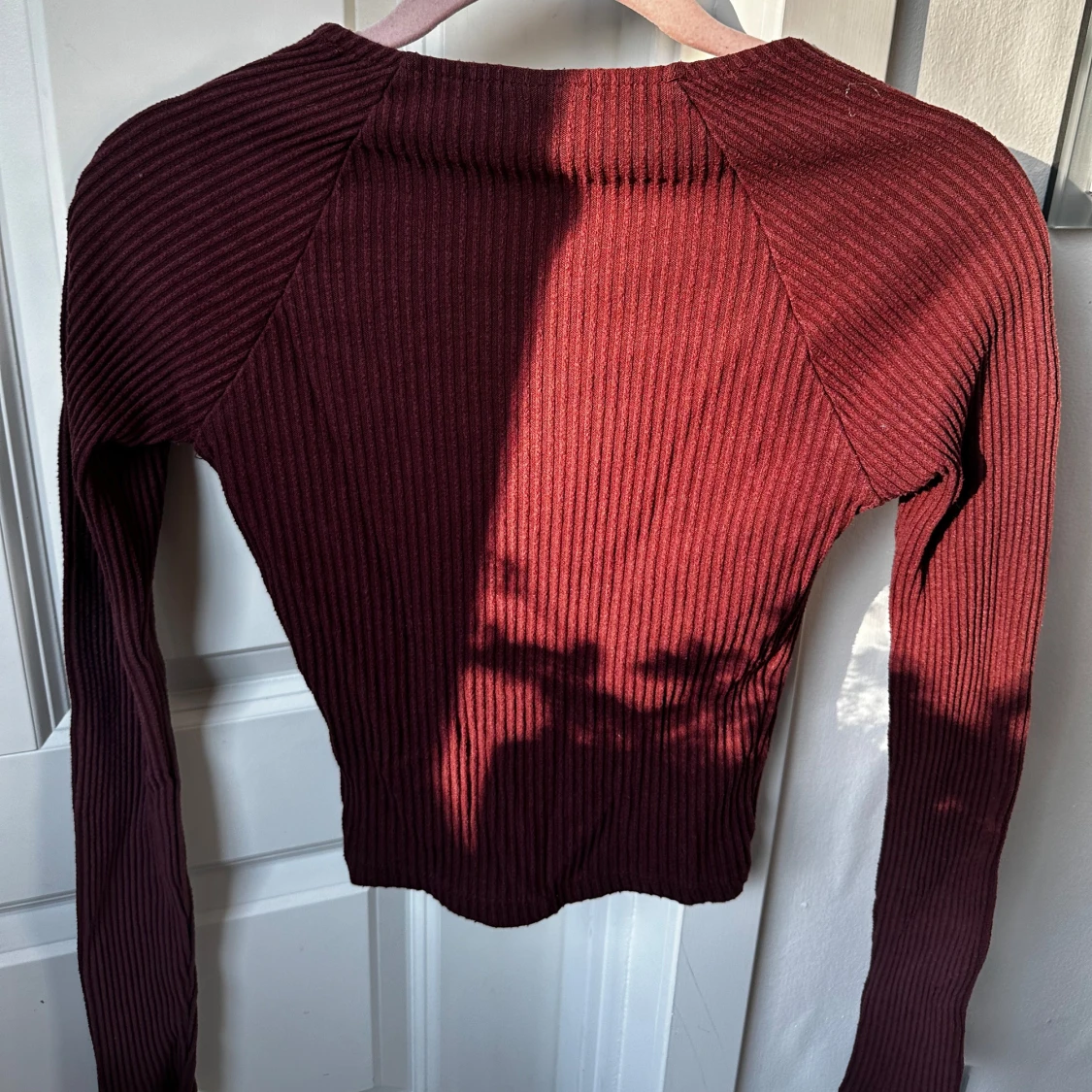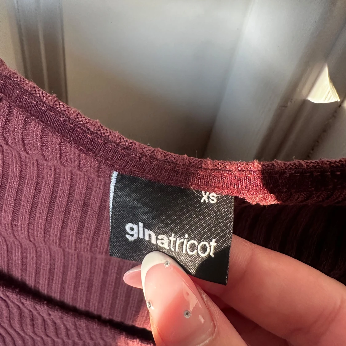 Säljer en vinröd ribbad långärmad tröja från Gina Tricot i storlek XS. Tröjan har v-ringning och är figurnära med croppad passform. Perfekt för lager-på-lager eller som den är till jeans eller kjol.