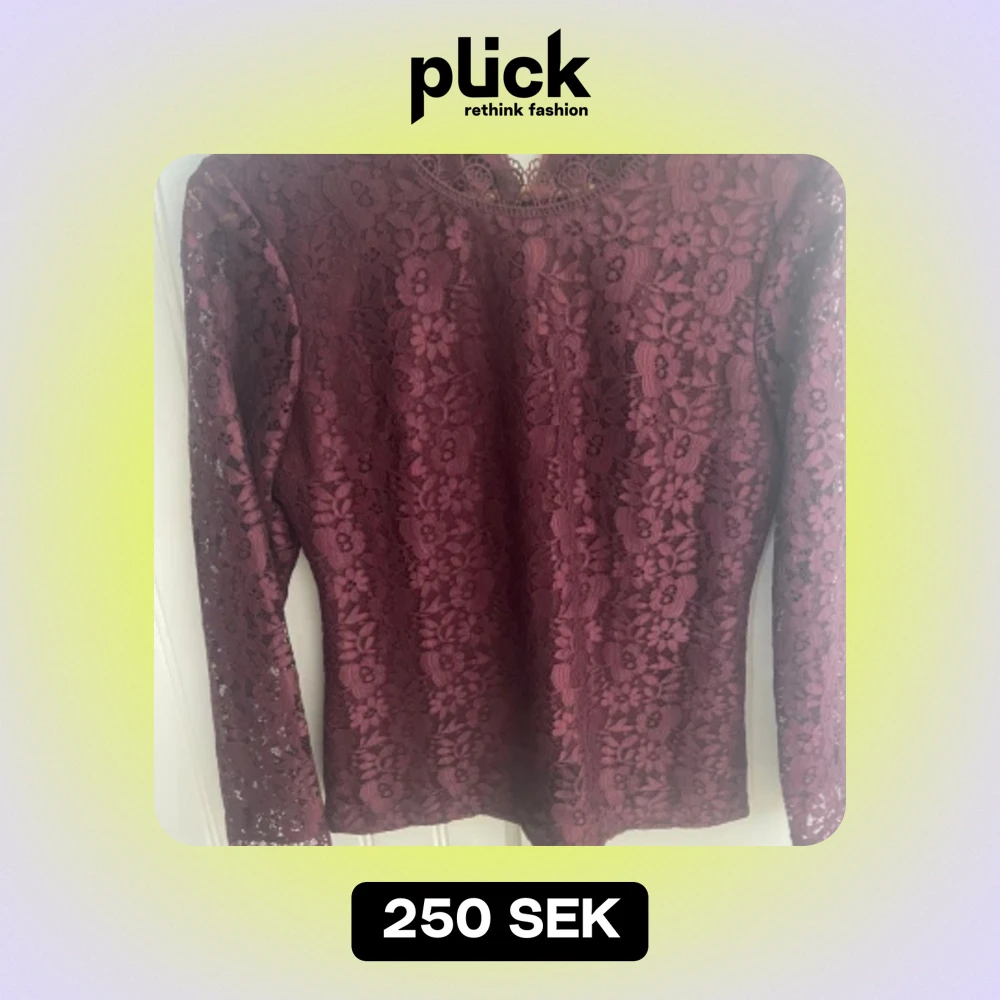 Säljer en superfin vinröd spetsblus. Den har ett vackert blommönster och långa ärmar. Perfekt för höst och vinter, och kan lätt kläs upp för festliga tillfällen. Blusen är i nyskick och har en tight passform. Passar perfekt till både jeans och kjol!