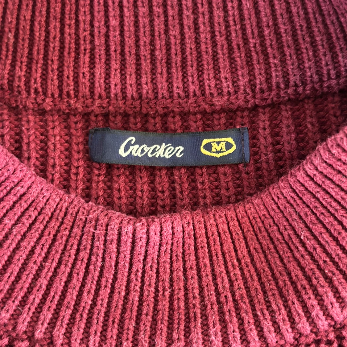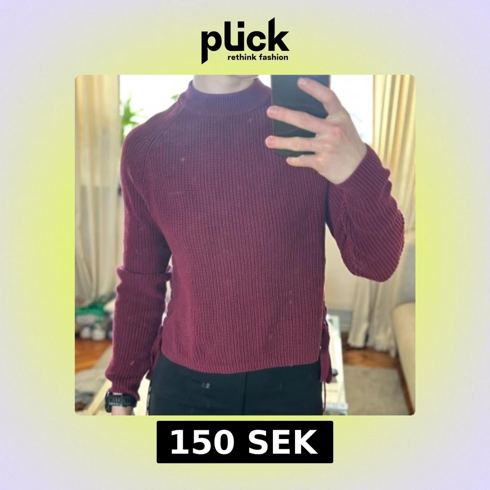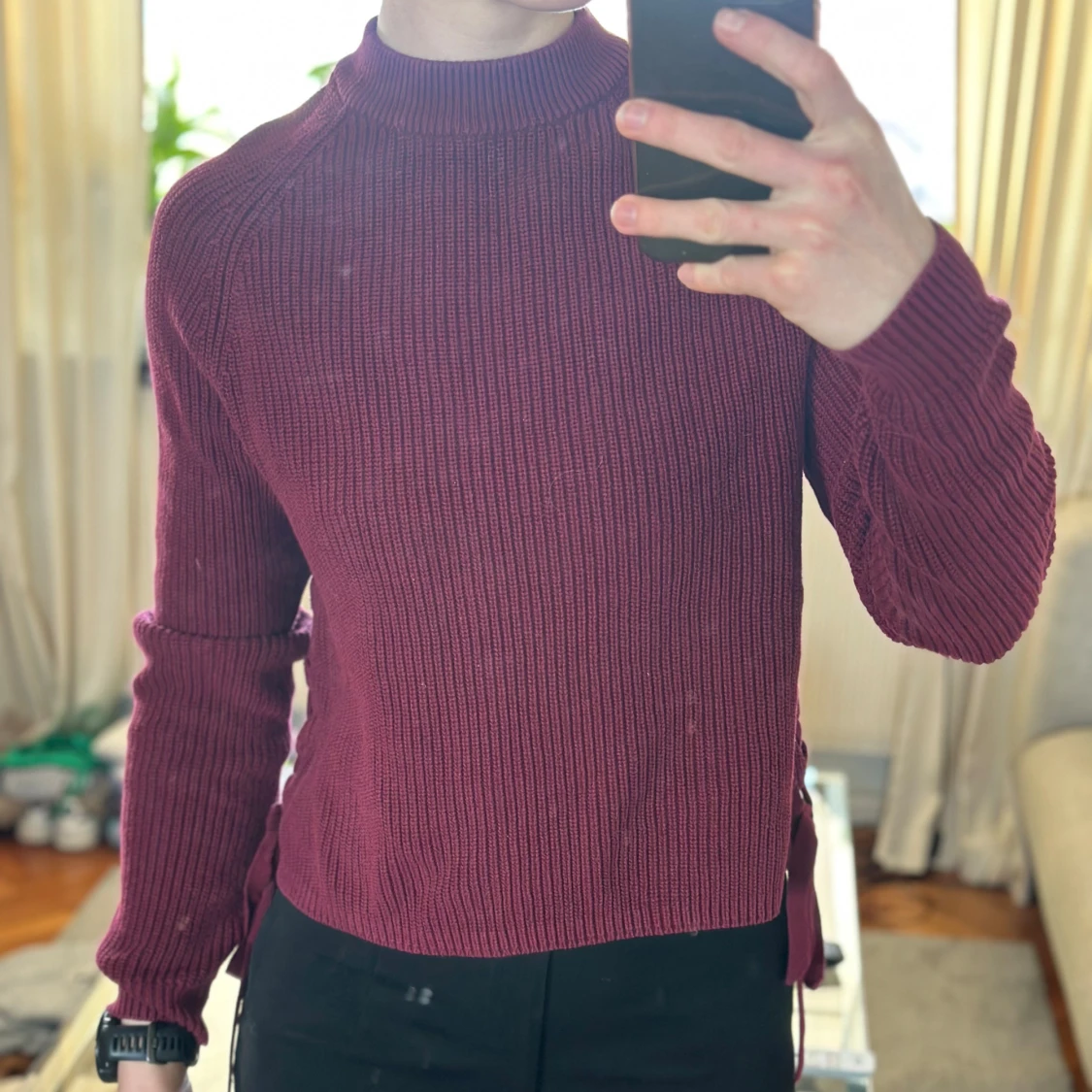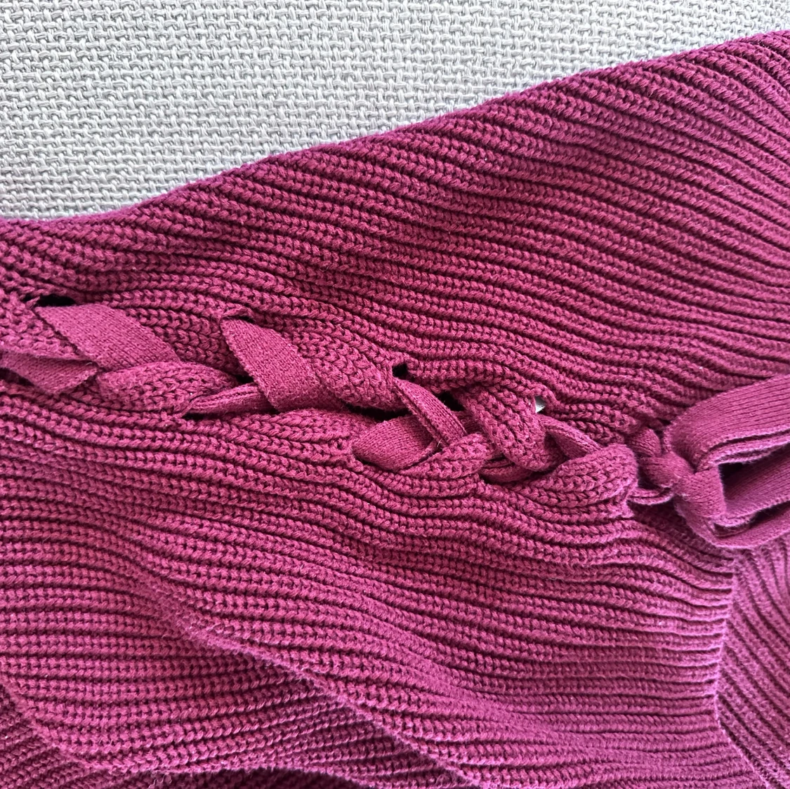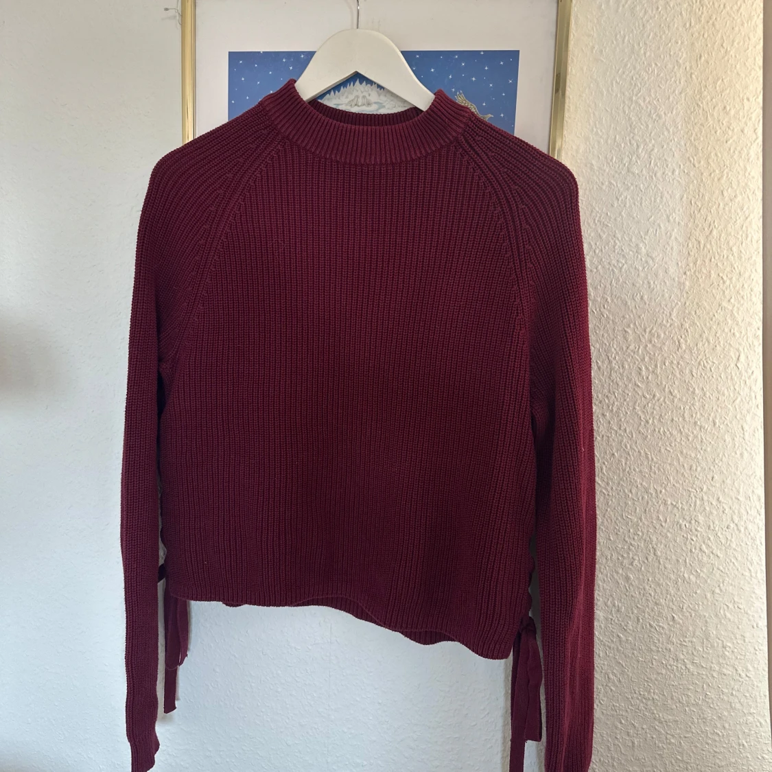 Säljer en vinröd stickad tröja från Crocker. Tröjan har långa ärmar och en snygg snörningsdetalj på sidorna.