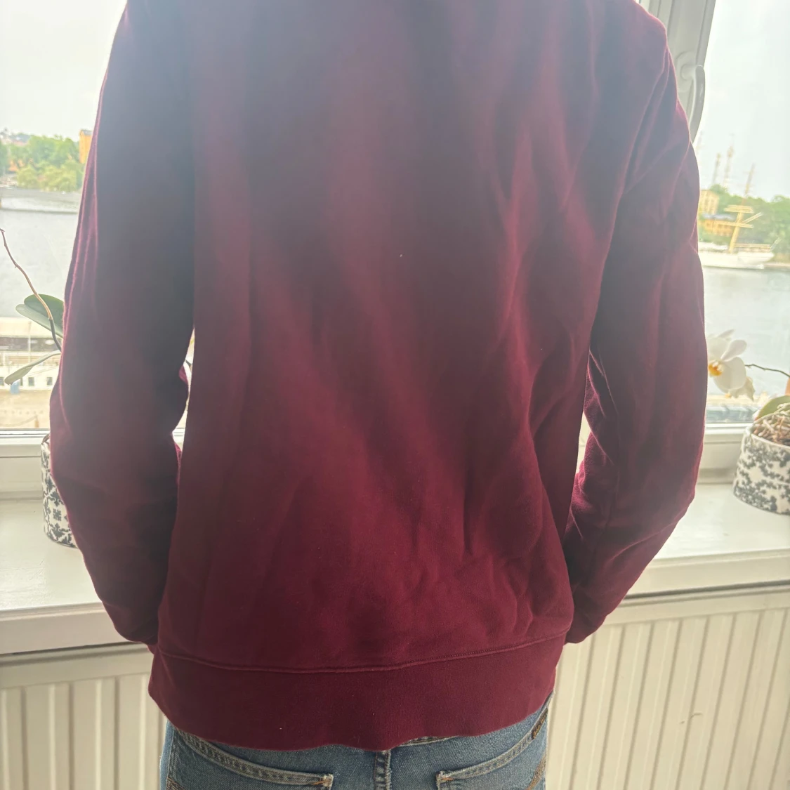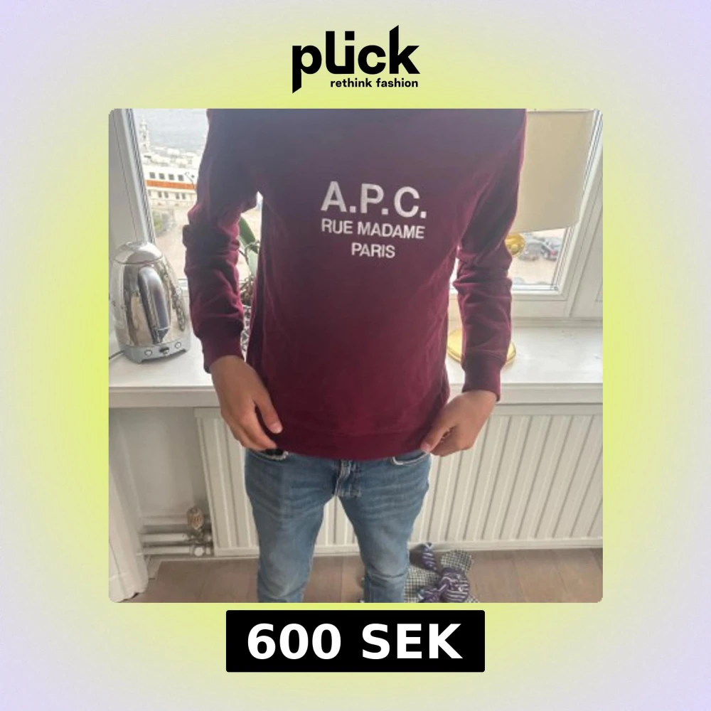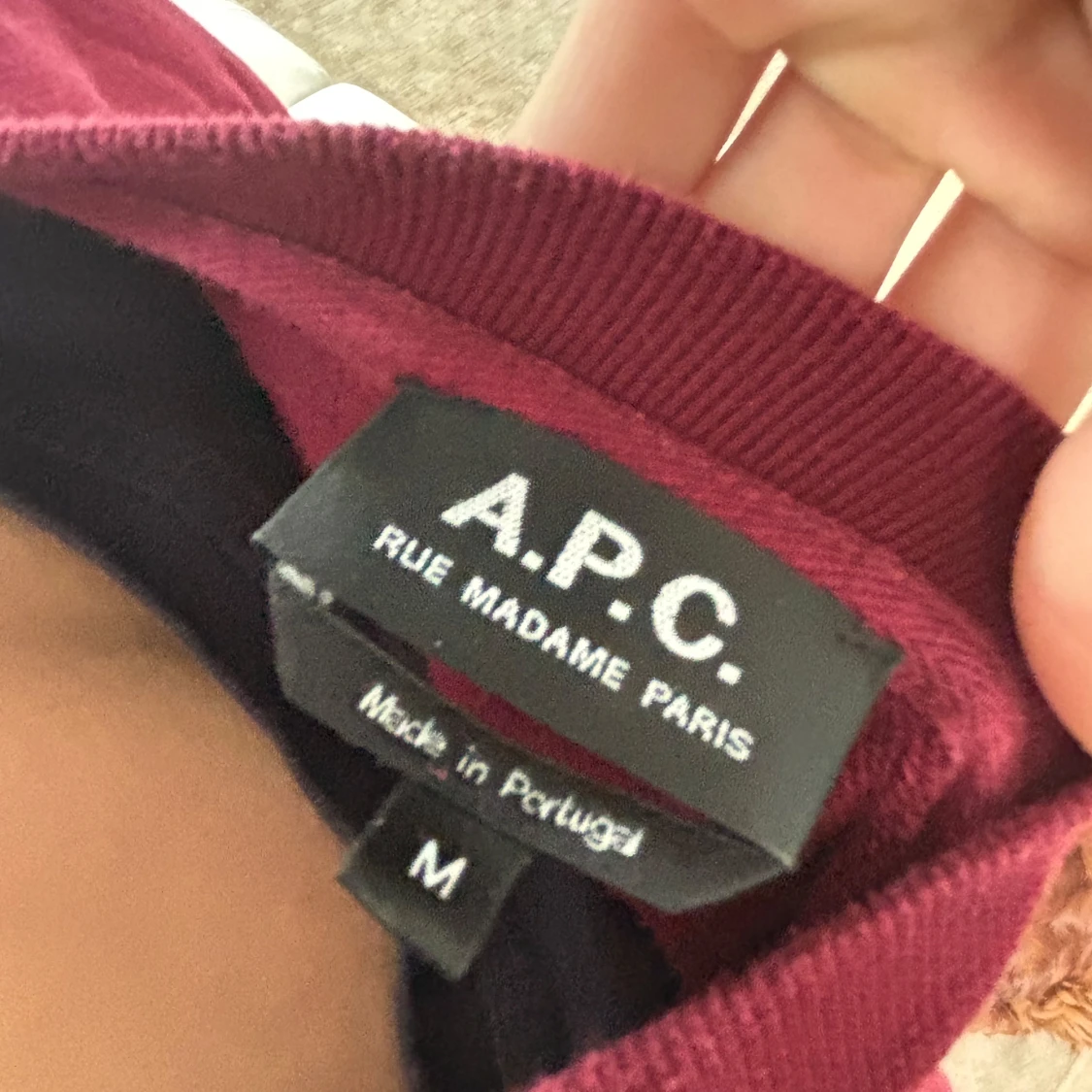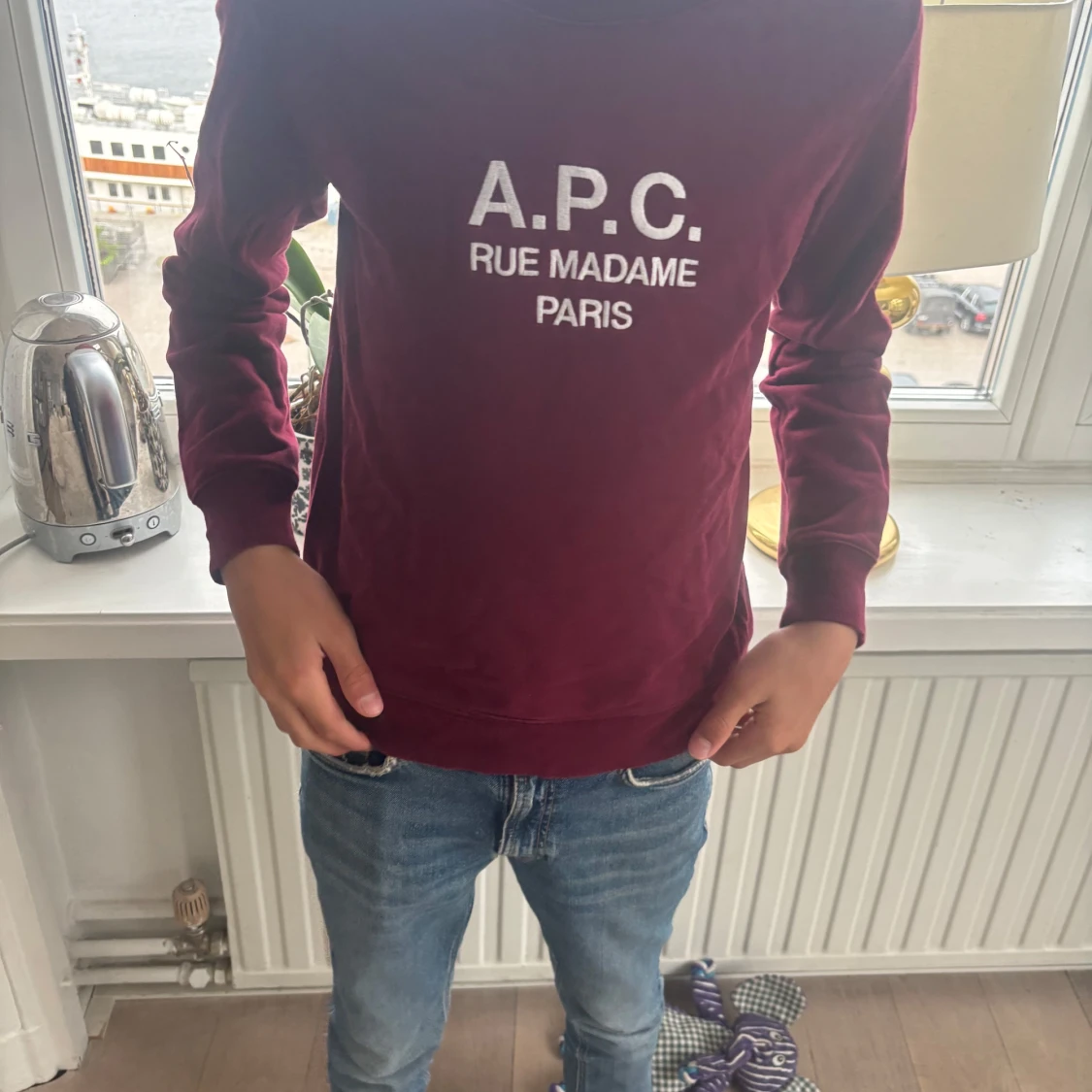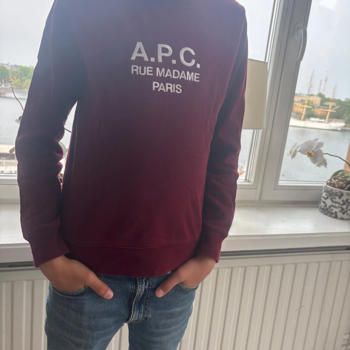 Vinröd sweatshirt från A.P.C. med vit broderad text 'A.P.C. RUE MADAME PARIS' på bröstet. Klassisk rund hals, långa ärmar och ribbade muddar. Skön passform och tillverkad i mjuk bomull, perfekt för en clean och stilren look.