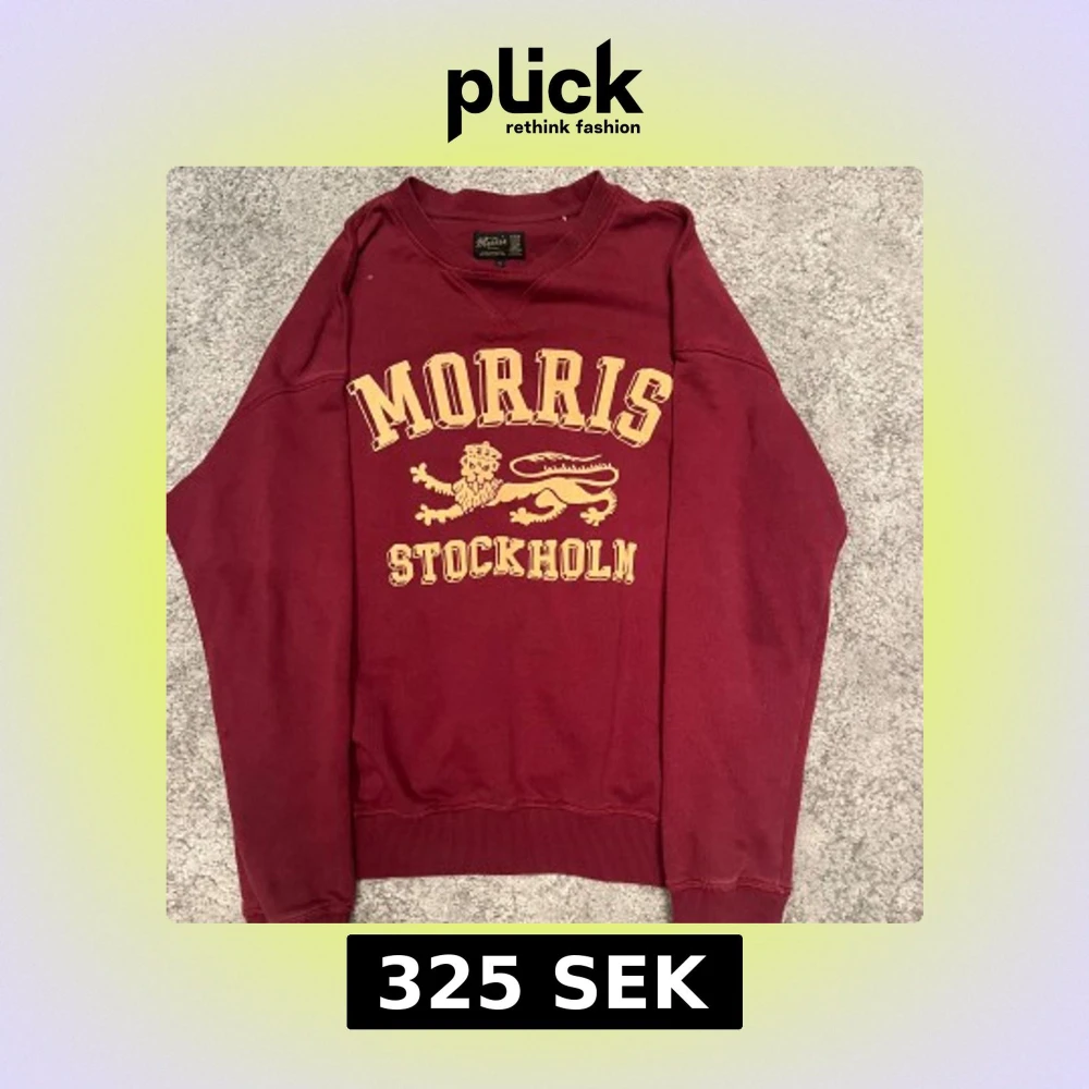 Snygg vinröd sweatshirt från Morris med stort gult tryck framtill där det står 'Morris Stockholm' och ett lejonmotiv. Tröjan har rund hals, långa ärmar och ribbade muddar. Perfekt för en chill och stilren look.