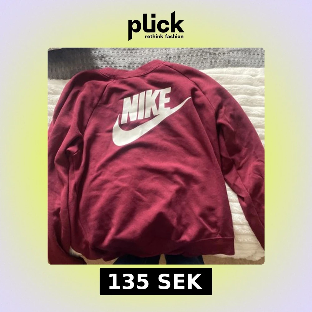 Säljer en vinröd sweatshirt från Nike med stor vit logga på ryggen. Tröjan har rund hals och långa ärmar, perfekt för en sportig och avslappnad stil.