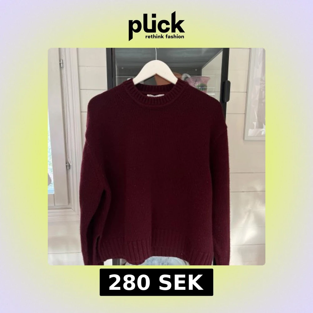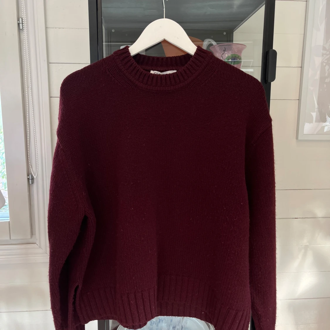 Vinröd stickad tröja från Zara med rund hals och ribbade muddar vid ärmslut och nederkant. Tröjan har en loose passform och är långärmad, perfekt för att hålla dig varm under kyliga dagar. Enkel och stilren design som funkar till många olika looks.