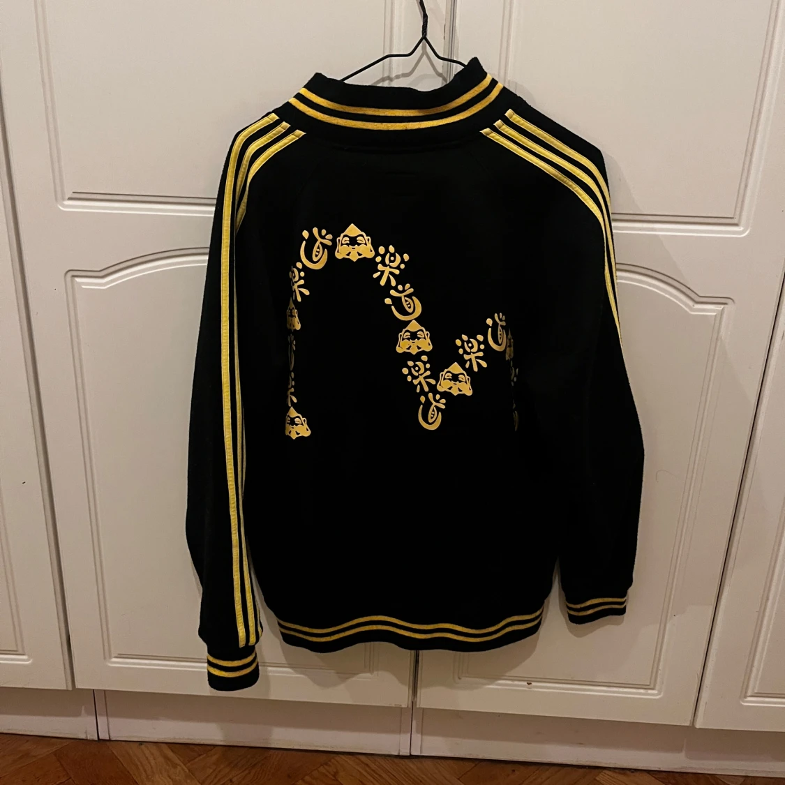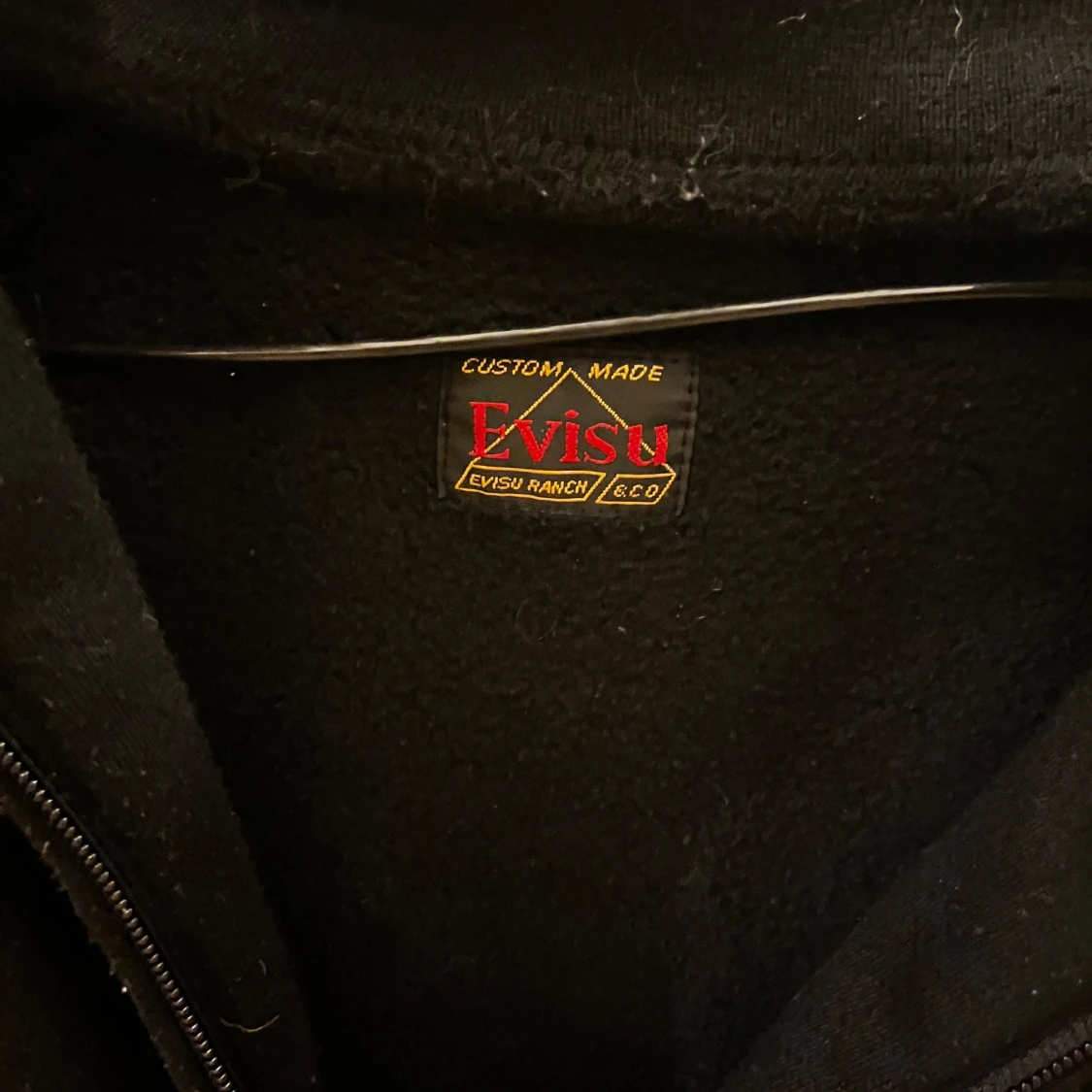 Snygg svart zip tröja från Evisu med gula detaljer och mönster. Jackan har dragkedja och långa ärmar med ribbade muddar. Den har ett unikt tryck på ryggen och märkeslogga på framsidan. Perfekt för dig som vill sticka ut! Vintage i nice stil. Passar nån runt 170-175