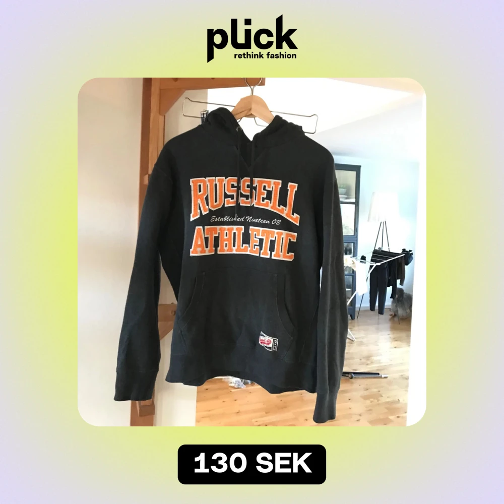 Säljer en svart/grå hoodie från Russell Athletic i storlek medium. Den har en stor, orange och vit logga på framsidan och en klassisk känguruficka. Perfekt för en avslappnad stil eller träning. Huvan har dragsko för justering. Skön och bekväm för kyliga dagar.