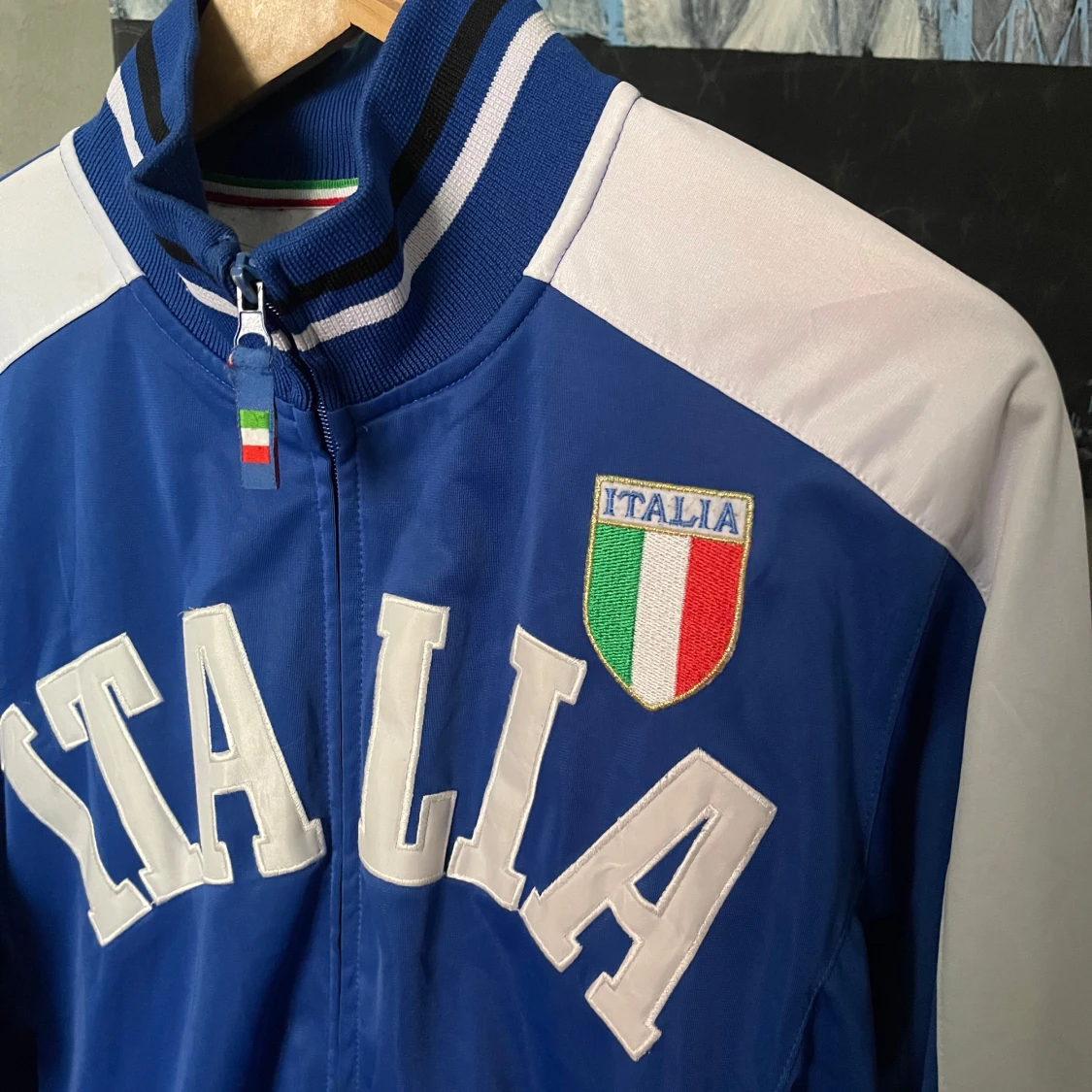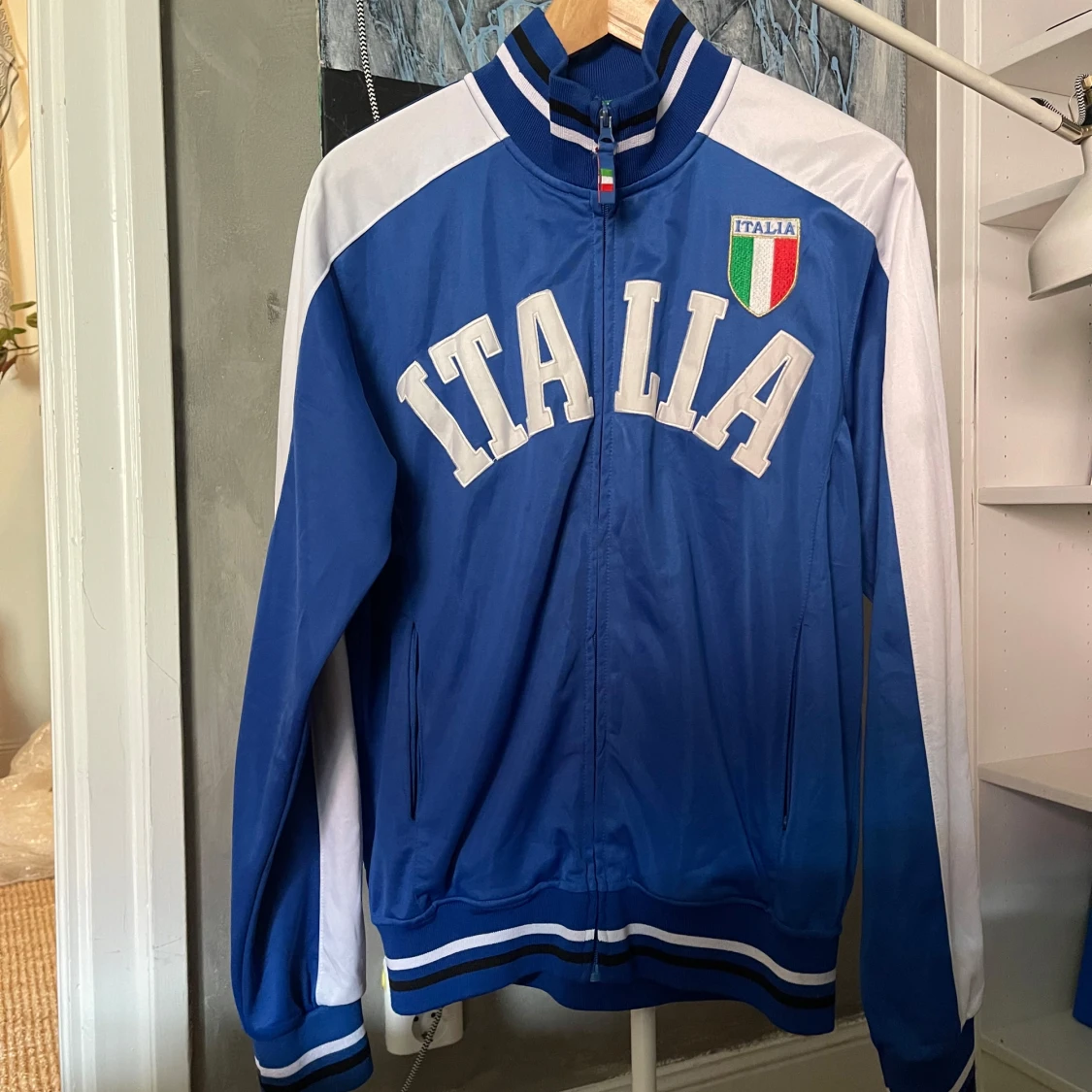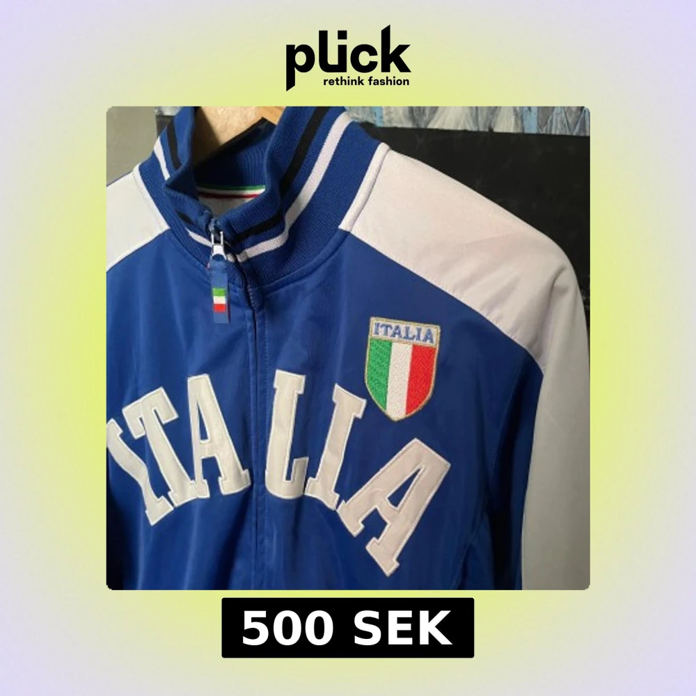 Säljer en blå och vit track jacket med 'ITALIA' tryckt på bröstet och Italiens flagga som emblem. Jackan har dragkedja, ståkrage och randiga muddar. Supersnygg men för stor på mig :(