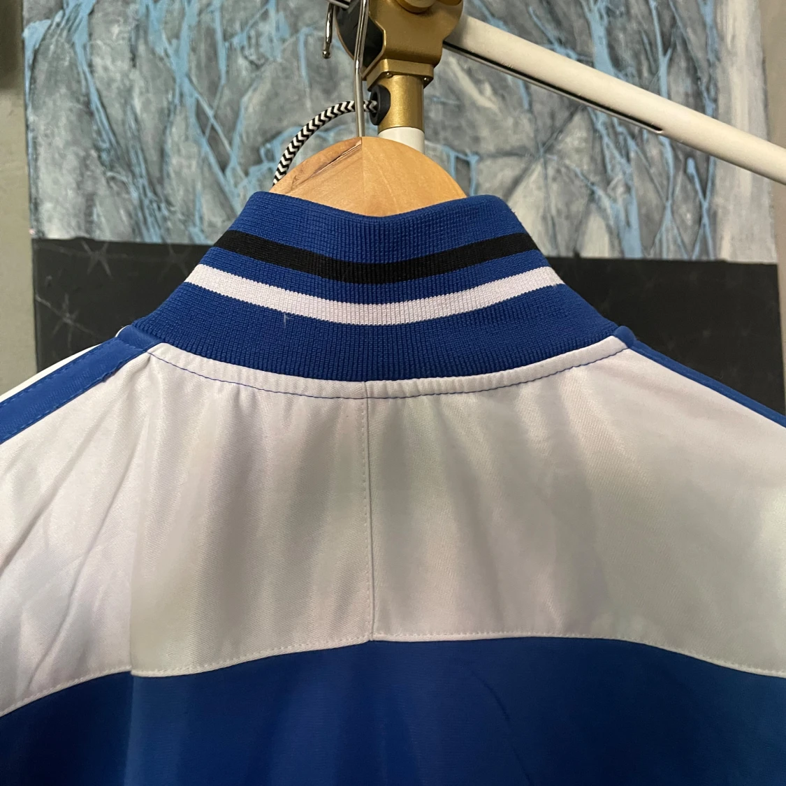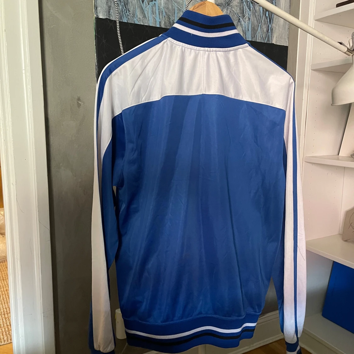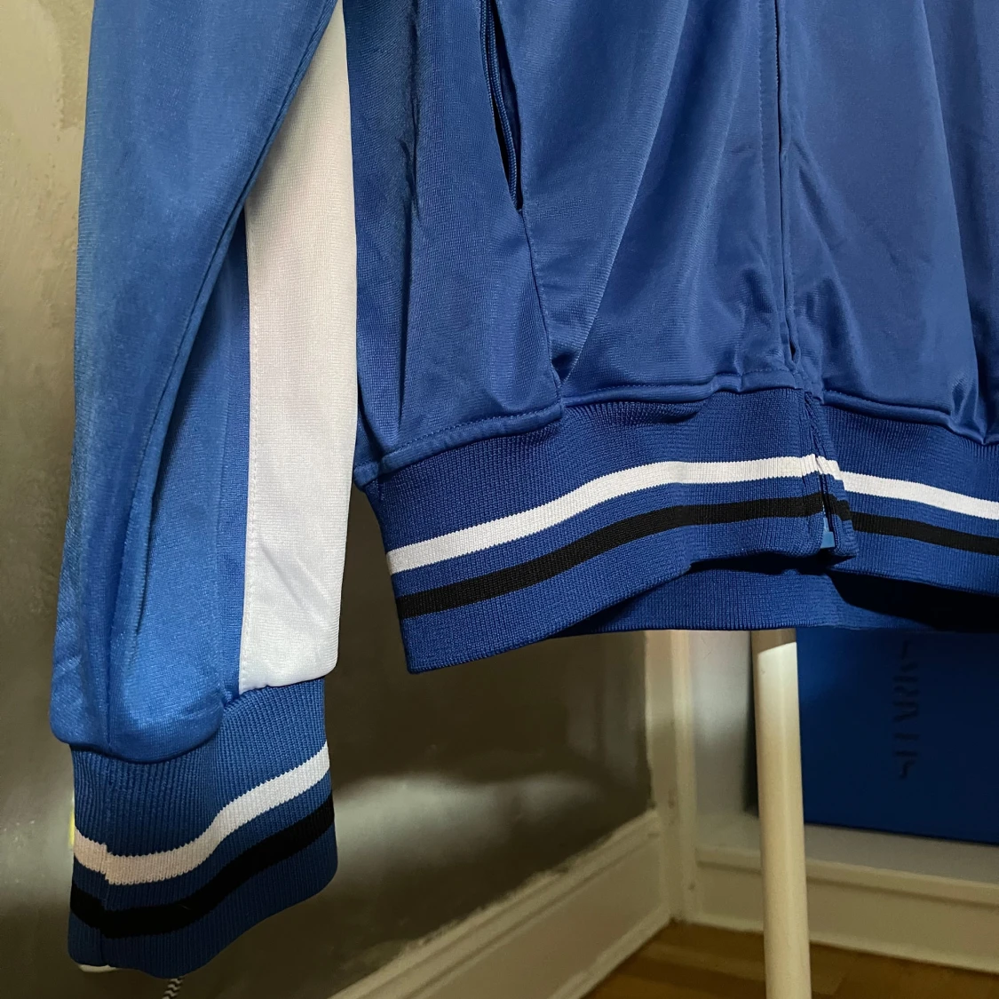 Säljer en blå och vit track jacket med 'ITALIA' tryckt på bröstet och Italiens flagga som emblem. Jackan har dragkedja, ståkrage och randiga muddar. Supersnygg men för stor på mig :(