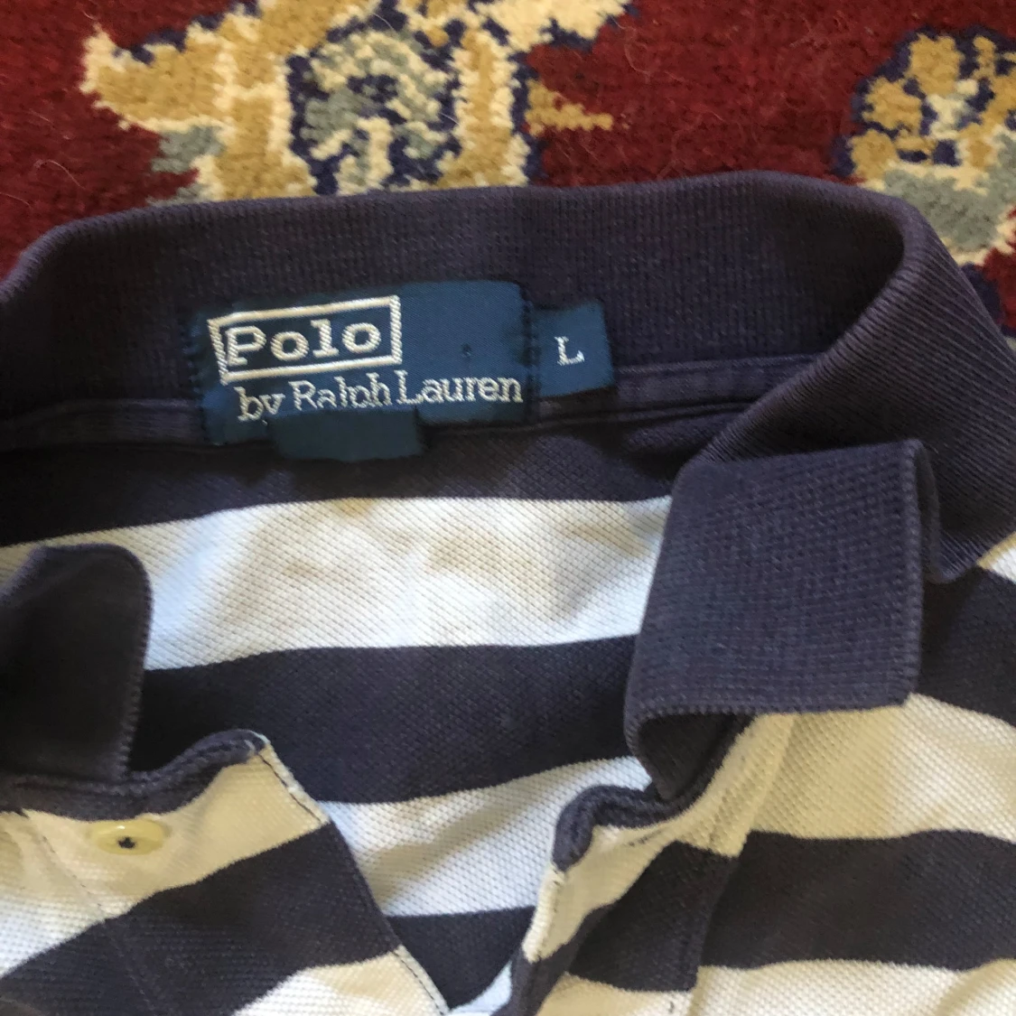 Säljer en klassisk svartvit randig pikétröja från Ralph Lauren. Tröjan har korta ärmar och en liten röd logga på bröstet. Perfekt för en stilren look.