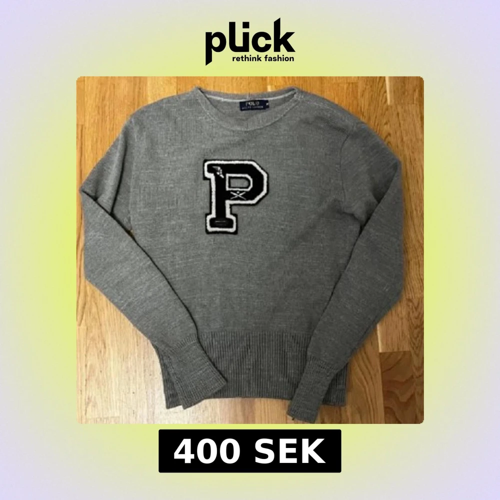 Grå stickad tröja från Polo Ralph Lauren med svartvit P-applikation. Klassisk college-stil med rund hals och ribbade muddar. Midjan har krympt något – perfekt för slim fit och passar även Small.