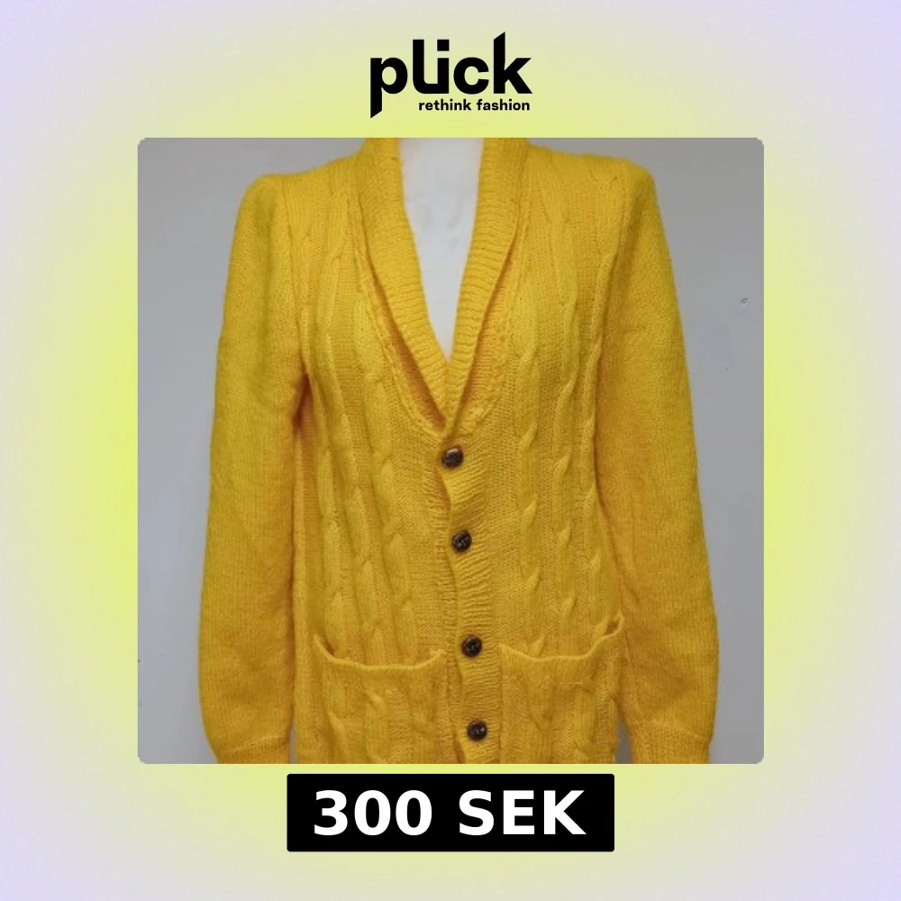 Säljer en underbar äkta vintage gul stickad kofta med kabelstickat mönster och sjalkrage.