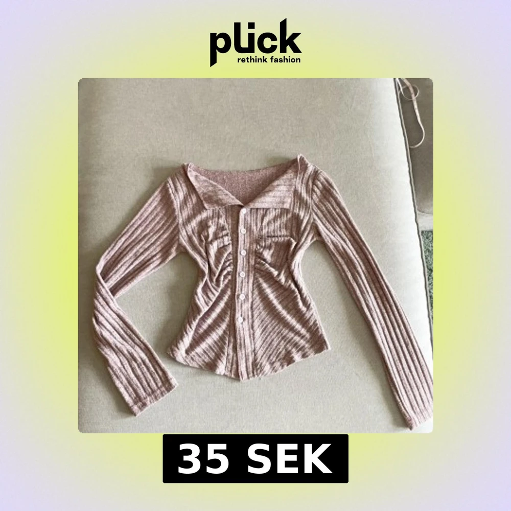 Säljer en ljusrosa ribbad kofta med långa ärmar och knappar framtill. Tröjan är croppad och har en bred krage. Perfekt för dig som gillar en trendig och feminin stil.