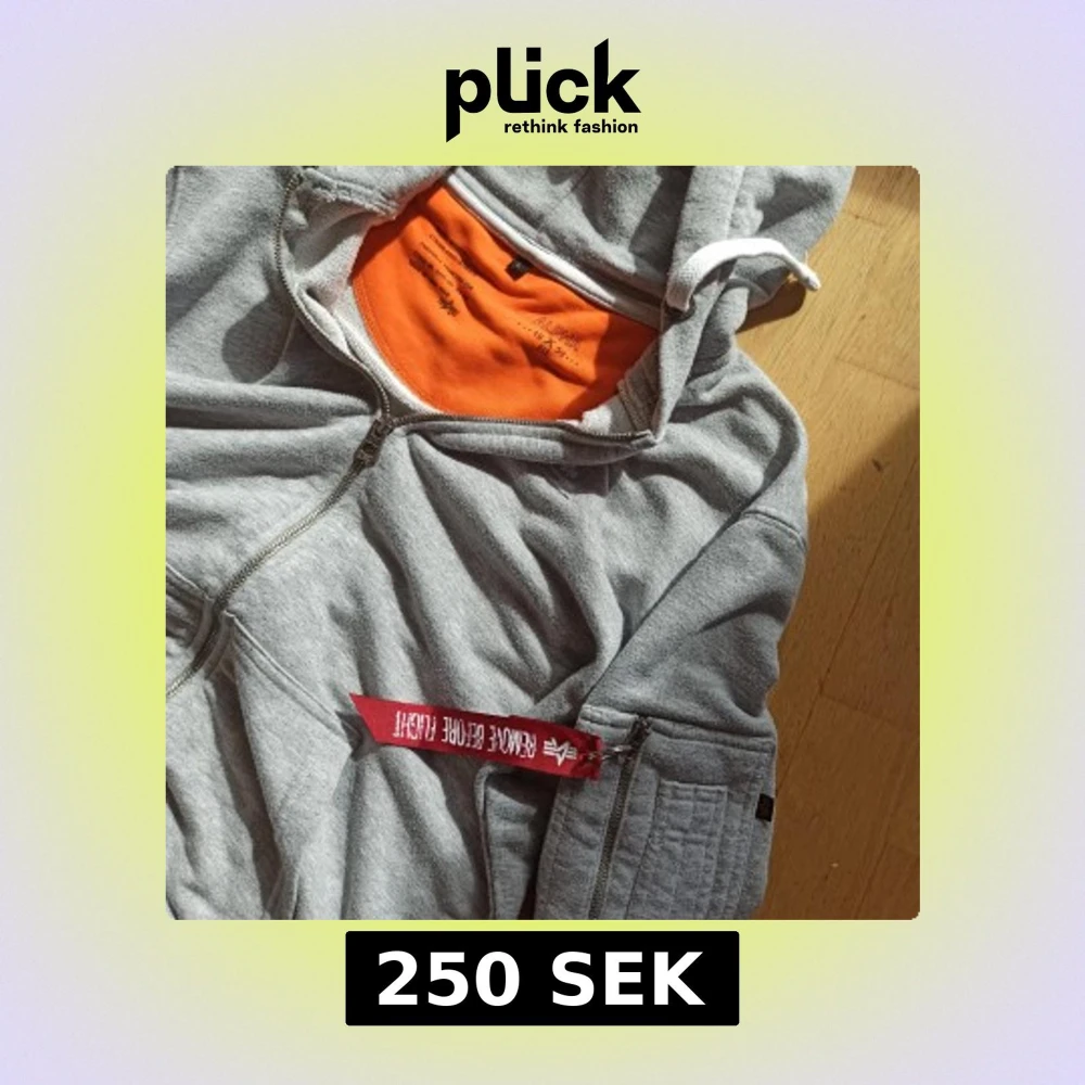 Säljer en grå hoodie från Alpha Industries med dragkedja, huva och orange insida. Klassisk röd tag på ärmen med texten 'Remove Before Flight'. Fickor fram och extra ficka på ärmen. Perfekt för dig som gillar streetwear och snygga detaljer. Mer information, bilder och prisdiskutering i dm. Äkta