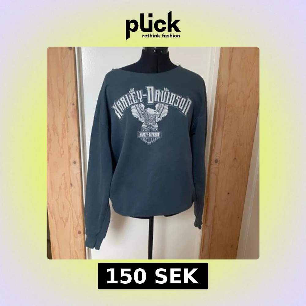 Säljer en smuts blå of shoulder sweatshirt från Harley-Davidson med tryck både fram och bak. Tröjan har långa ärmar och en avslappnad passform, perfekt för en casual look. Den är gjord i ett mjukt material som känns skönt mot huden.