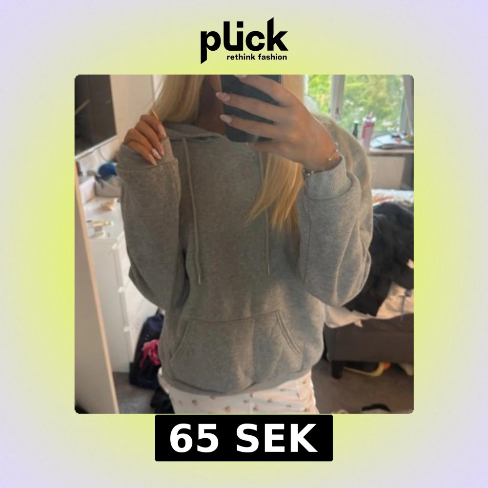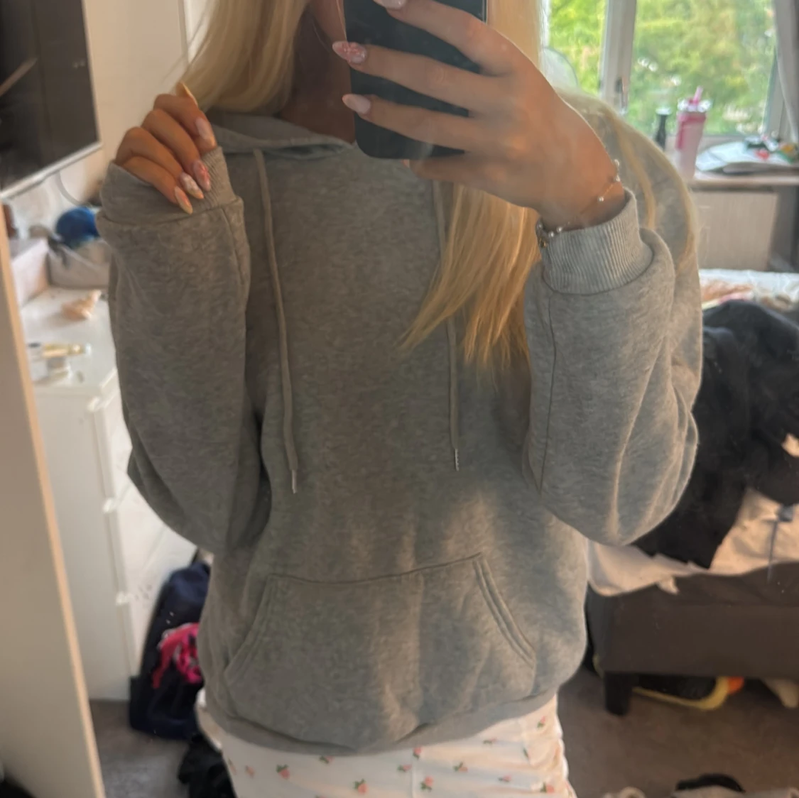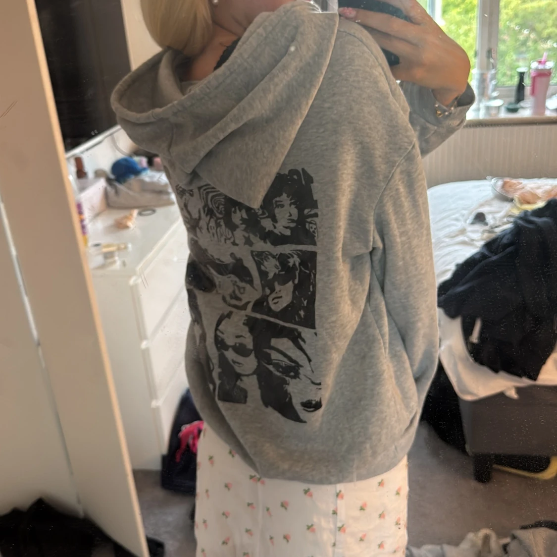 Säljer en grå hoodie med stor huva och snörning. På ryggen finns ett svart tryck med coola grafiska ansikten i seriestil. Perfekt för chill dagar eller när du vill ha en avslappnad look. 💓