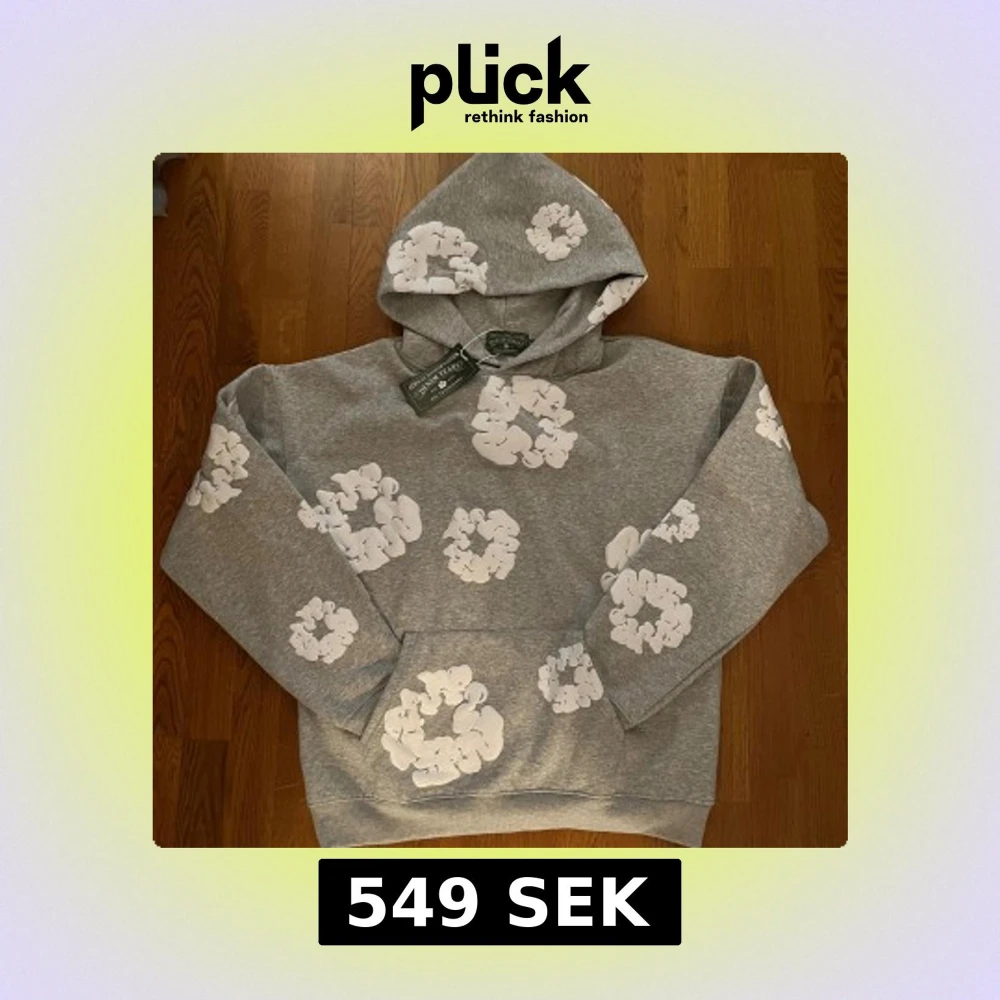 Säljer en grå hoodie från Denim Tears med stora vita blommönster tryckta över hela tröjan. Hoodien har huva, känguruficka och långa ärmar. Materialet är mjuk bomull och passformen är stor. Perfekt för dig som gillar streetwear och unika prints.