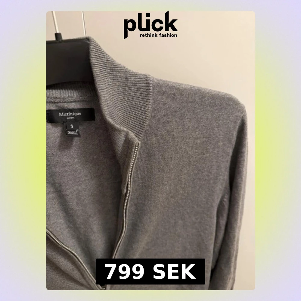 Snygg grå kofta från Matinique i storlek S. Tröjan har en ribbad krage, hel dragkedja framtill och långa ärmar. Materialet är mjukt och känns som bomull eller en bomullsblandning. Perfekt för lager-på-lager och chill stil.