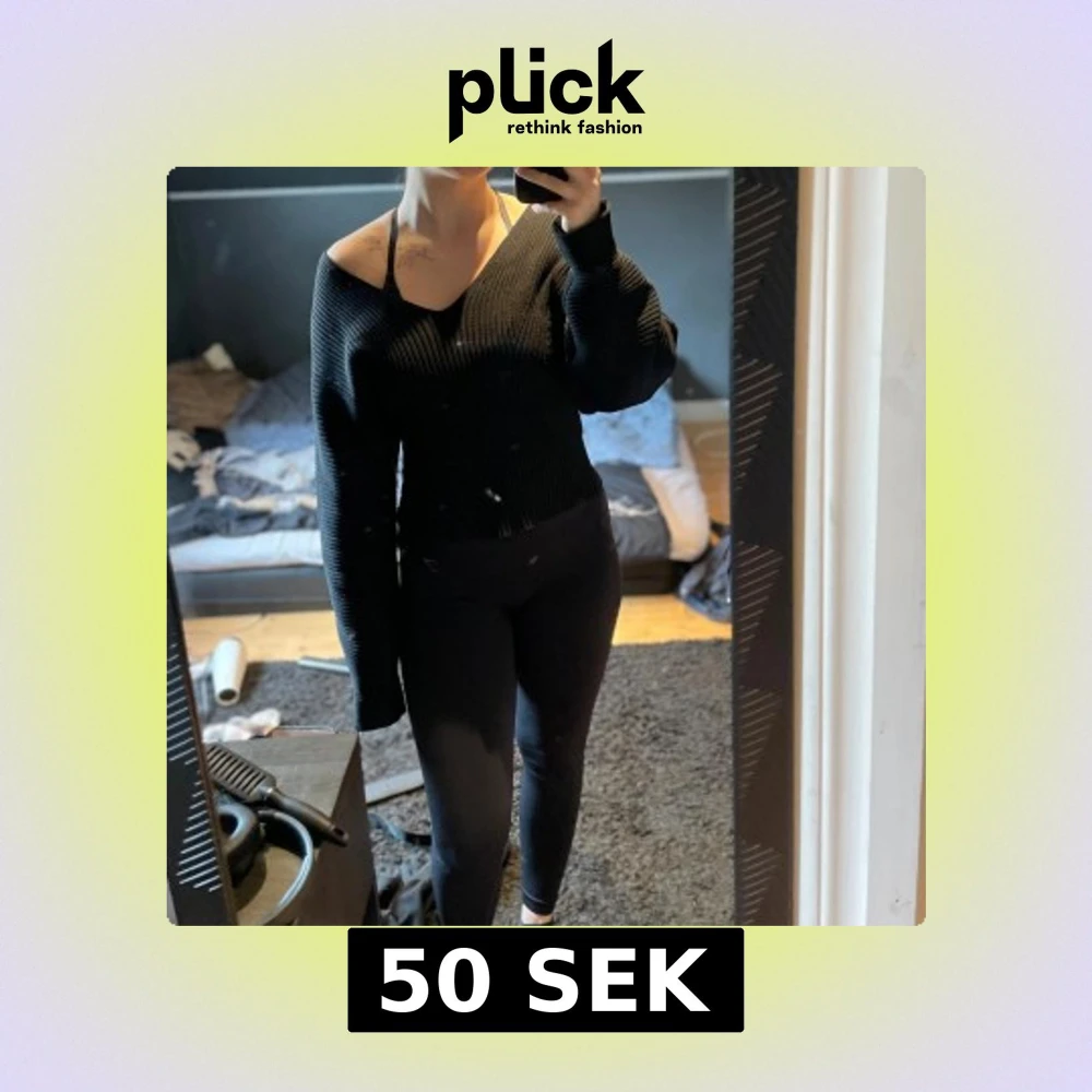 Svart stickad tröja med bred v-ringning och långa, vida ärmar. Tröjan har en ribbad struktur och sitter snyggt off-shoulder🖤