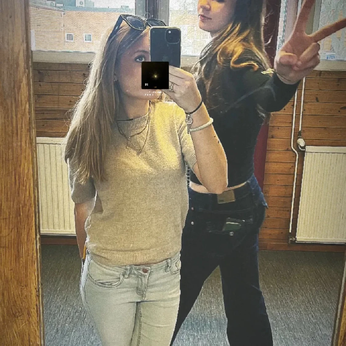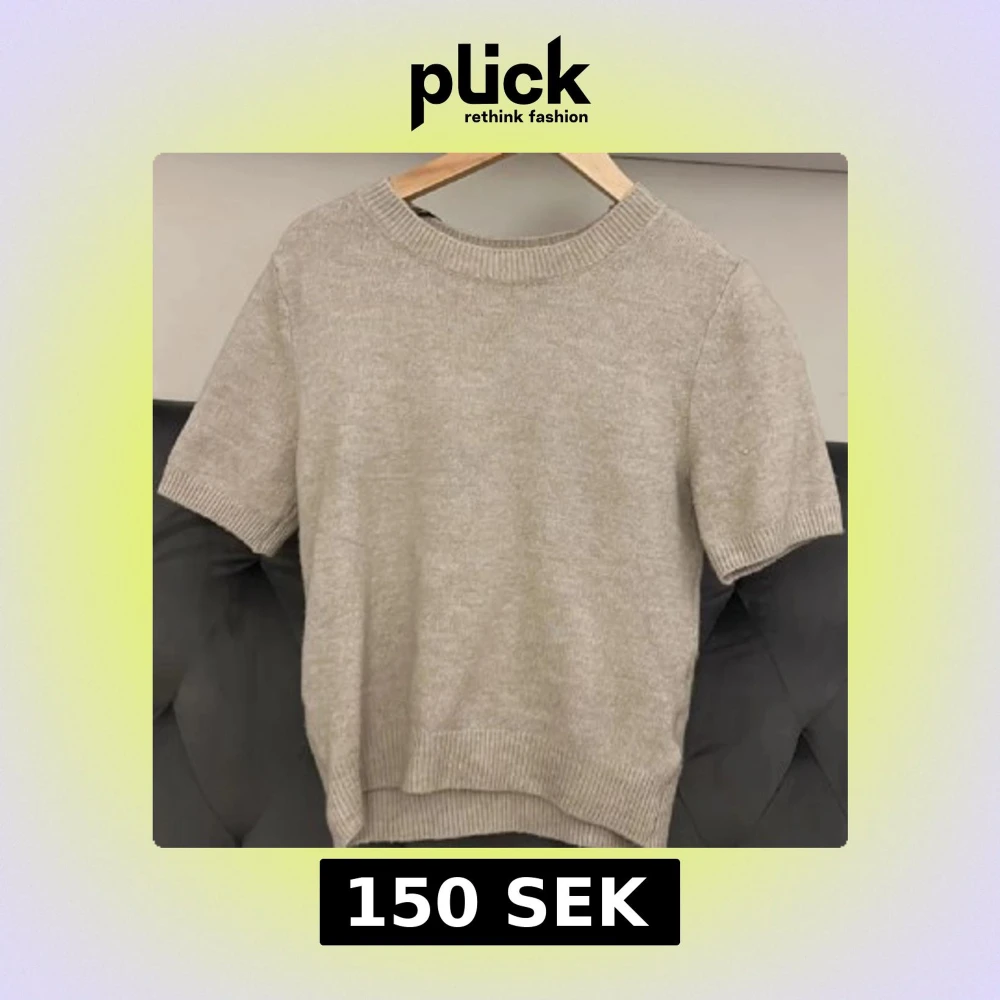 Superfin beige stickad tröja med korta ärmar och rund hals. Tröjan har ribbade muddar vid ärmslut och nederkant, vilket ger en snygg och enkel look. Perfekt att matcha med jeans eller kjol för en chill stil.