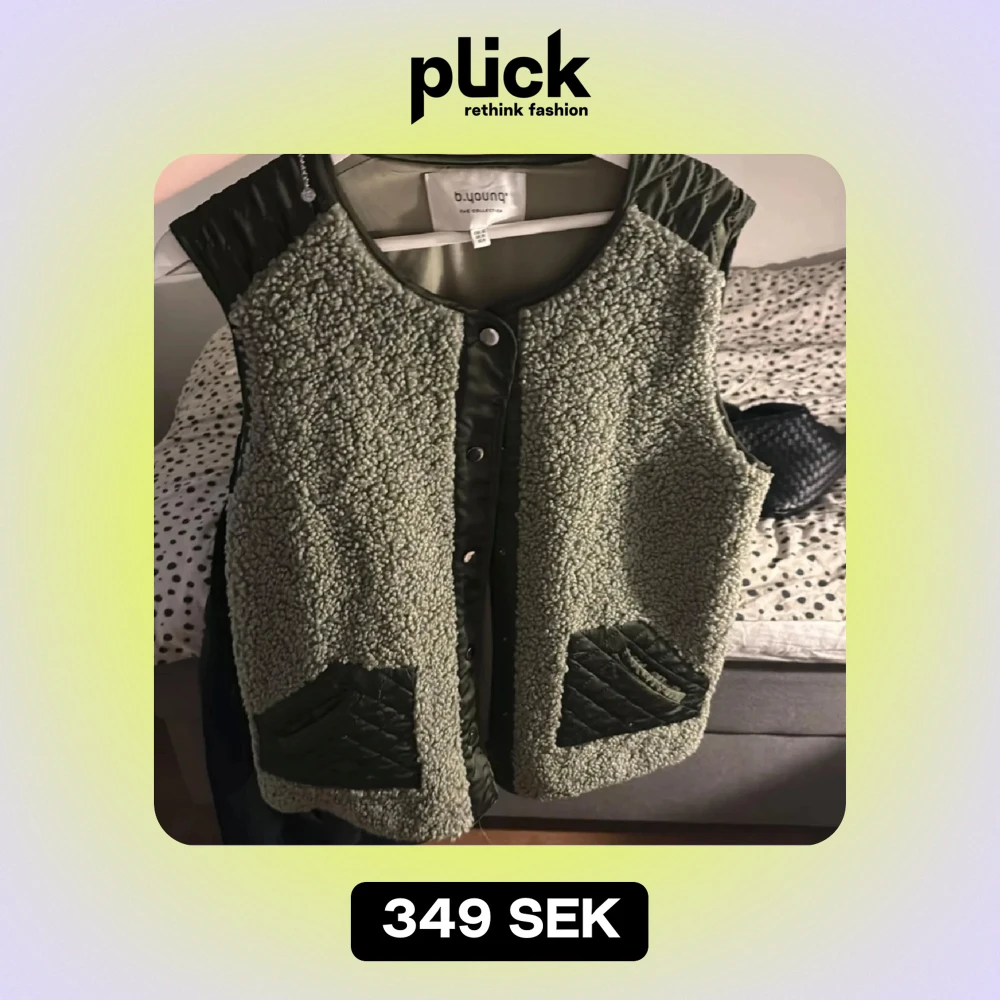 Säljer en supermysig olivgrön teddyväst från b.young. Västen har coola detaljer och knappar framtill. Perfekt för höst och vinter. Den är knappt använd och i mycket bra skick. Priset kan diskuteras 💕