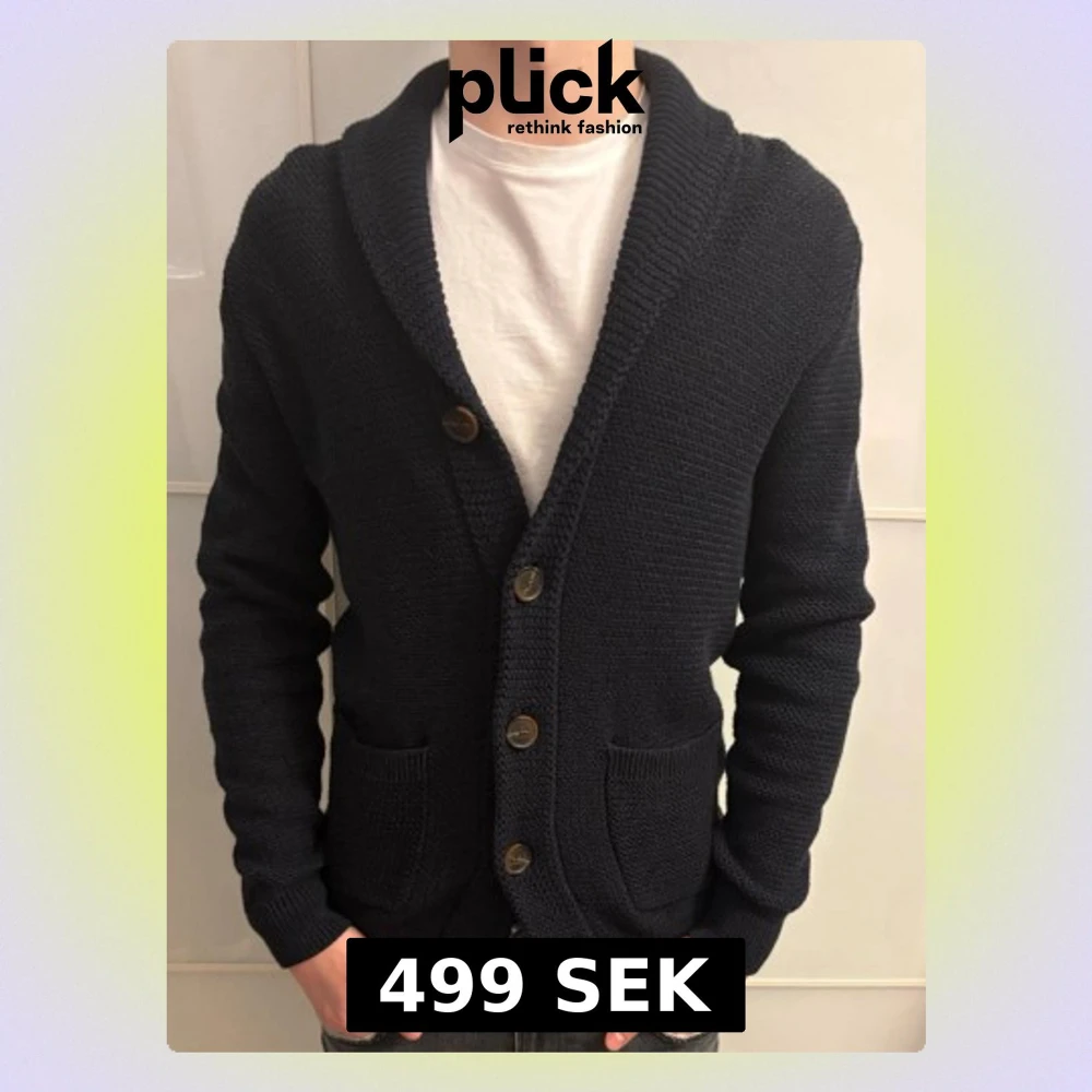 Säljer en mörkblå stickad kofta med grov struktur och stora bruna knappar framtill. Koftan har två fickor, bred krage och lång ärm. Perfekt för lager på lager under kyliga dagar.