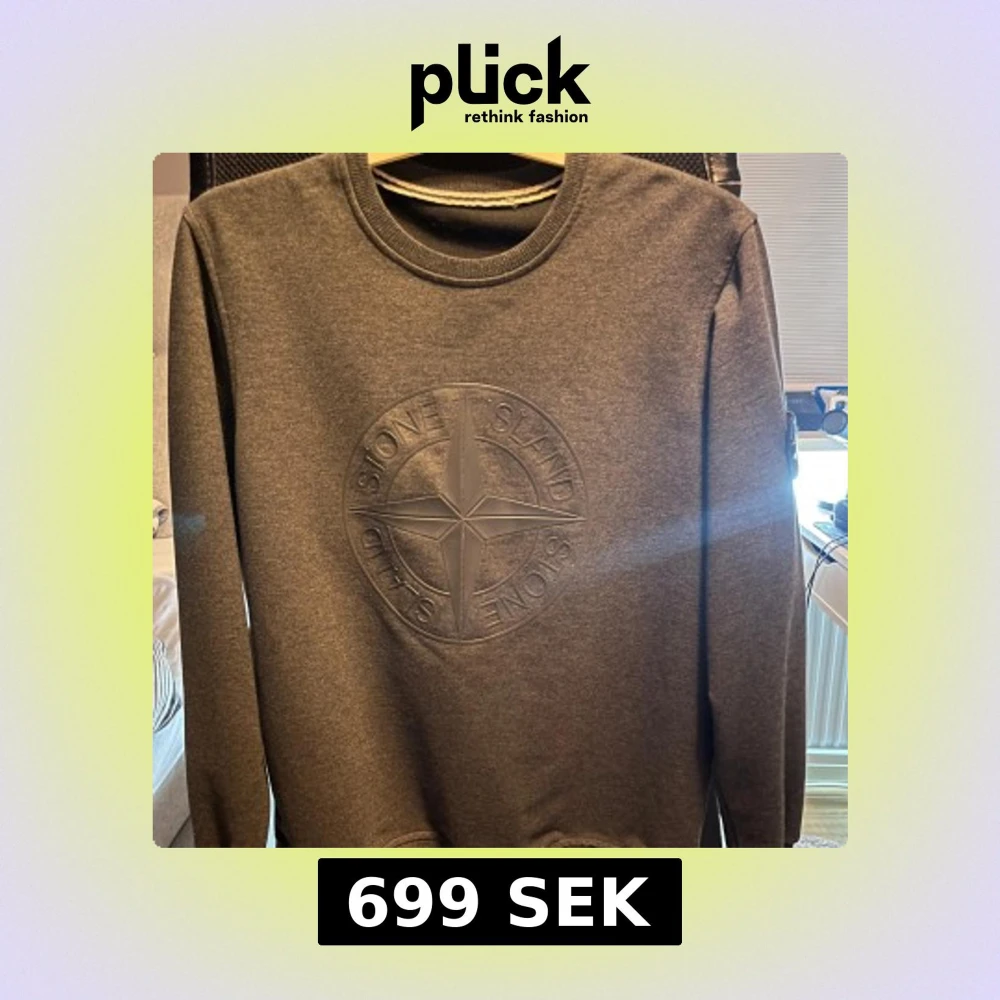 Säljer en stilren grå sweatshirt från Stone Island med deras ikoniska kompassmärke broderat på bröstet. Tröjan har långa ärmar och en rund halsringning. Perfekt för en avslappnad och trendig look.