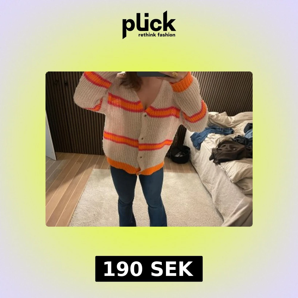 Säljer en loose-fit stickad kofta med breda ränder i orange och rosa på en beige bas. Koftan har v-ringning, knappar framtill och långärmade ärmar med orange muddar. Perfekt för dig som gillar färgglada och chill plagg.