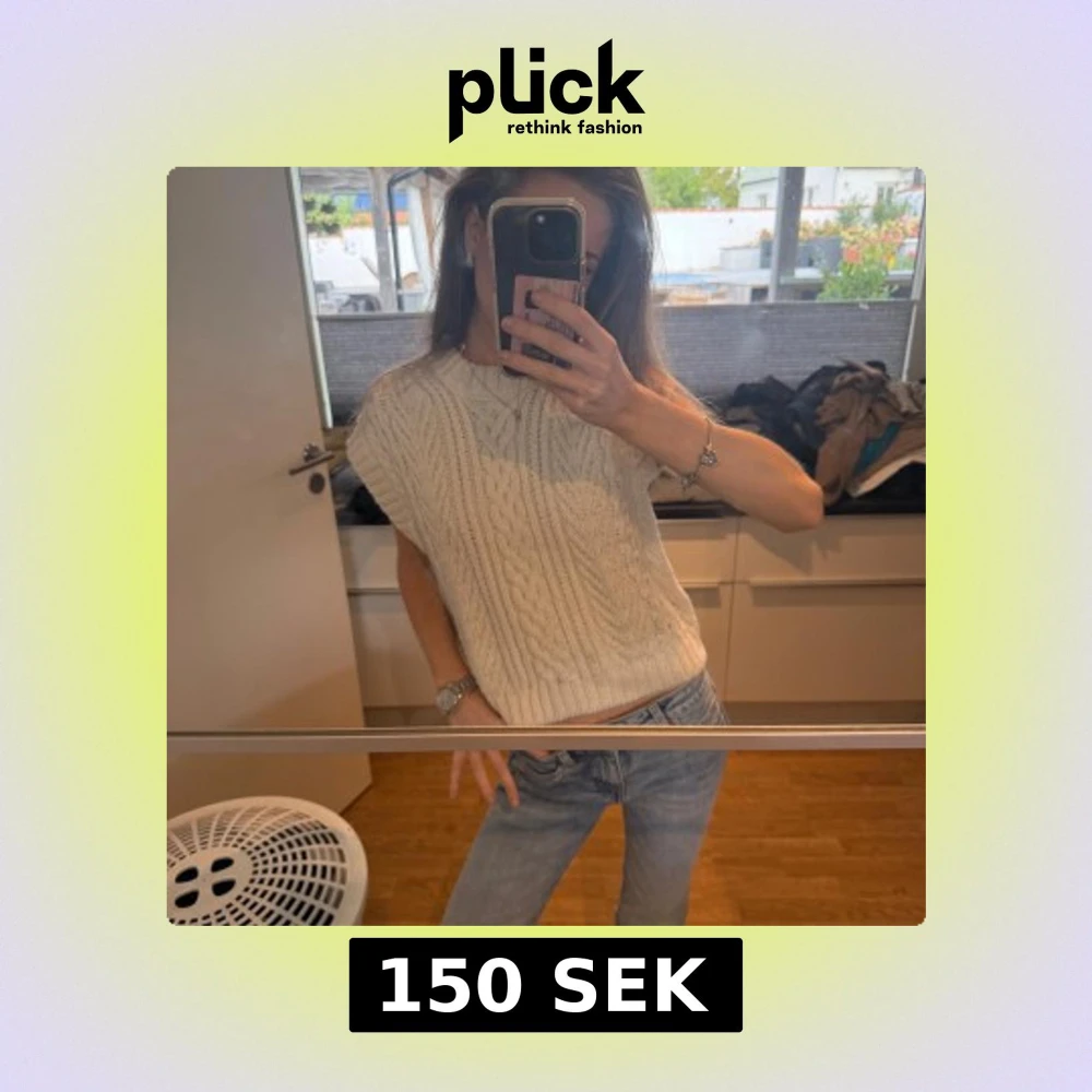 Säljer en vit stickad tröja med korta ärmar och klassiskt flätmönster.