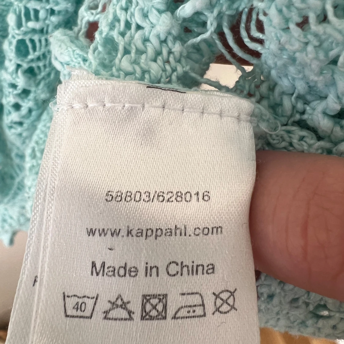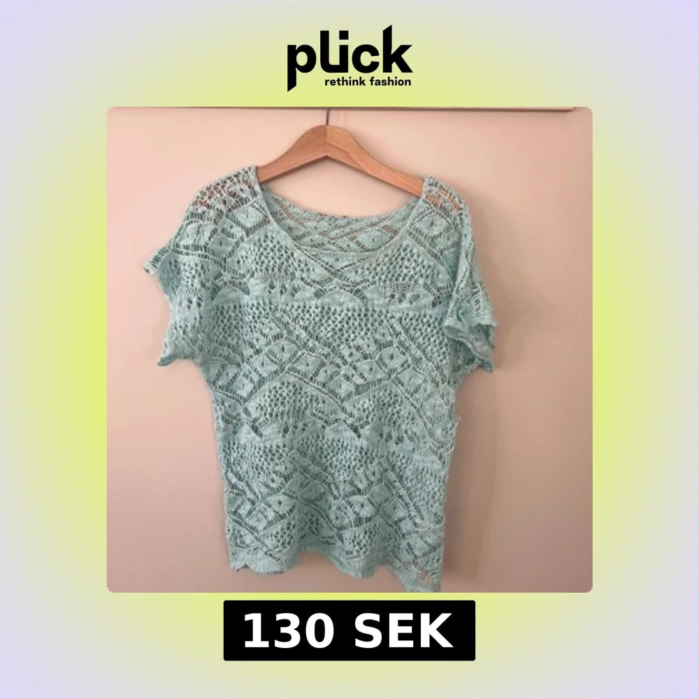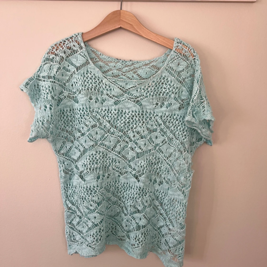 Säljer en ljusblå, spetsstickad topp från Kappahl. Tröjan har några defekter skriv mer för fler bilder