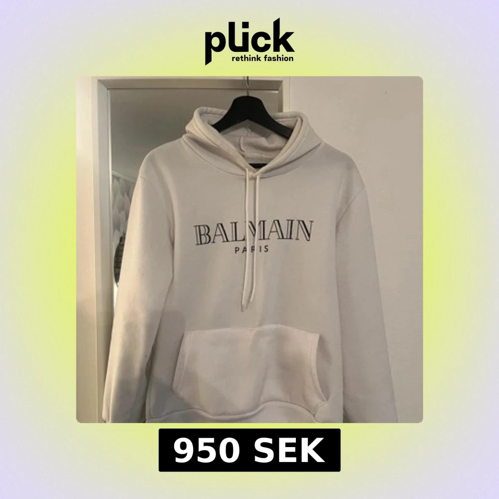 Säljer en stilren vit hoodie från Balmain Paris med svart tryck framtill. Tröjan har huva med dragsko och en stor magficka. Perfekt för dig som gillar exklusiva streetwear-plagg.