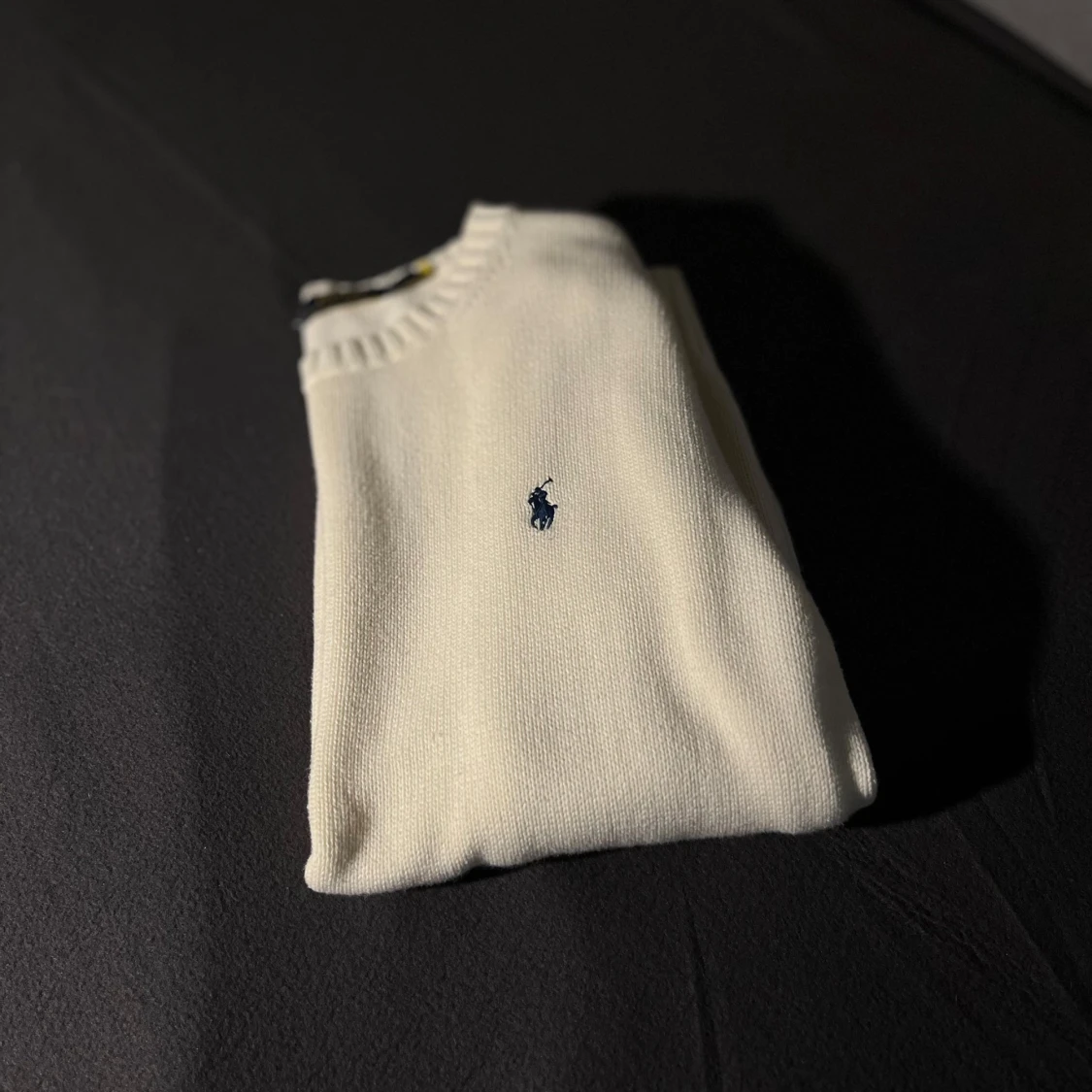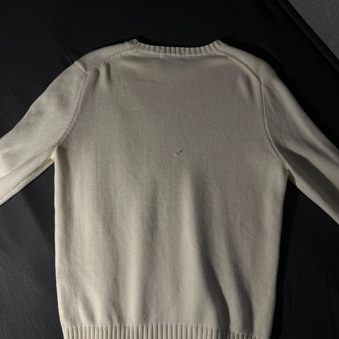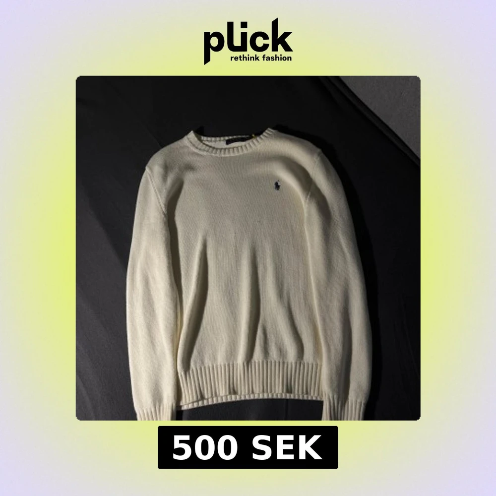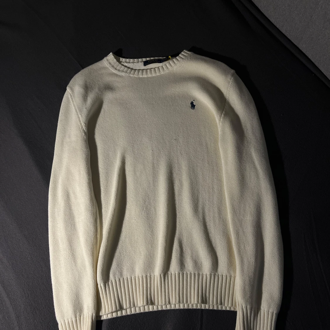 Vit/beige stickad tröja från Ralph Lauren till salu i okej skick, enda defekten på tröjan är ett litet hål i ryggen, annars är tröjan intakt! Hör av dig vid funderingar😀