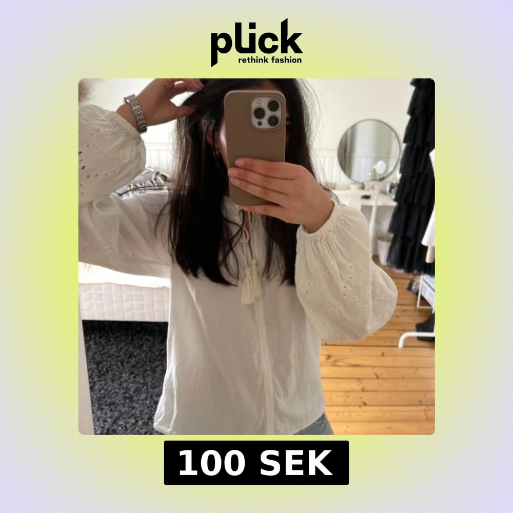 Säljer en fin vit blus från l.o.g.g x H&M med broderade detaljer på ärmarna och knytband vid halsen. Perfekt för vår och sommar!