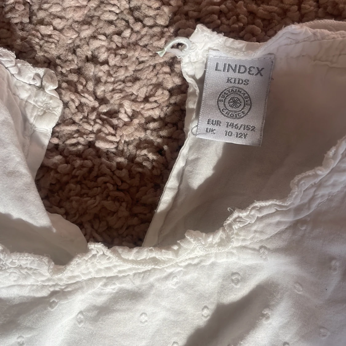 Supersöt vit blus från Lindex med diskret prickigt mönster och fina spetsdetaljer vid halsen. Luftigt tyg och lång ärm, perfekt för vår och sommar. Passar dig som gillar romantisk och feminin stil.