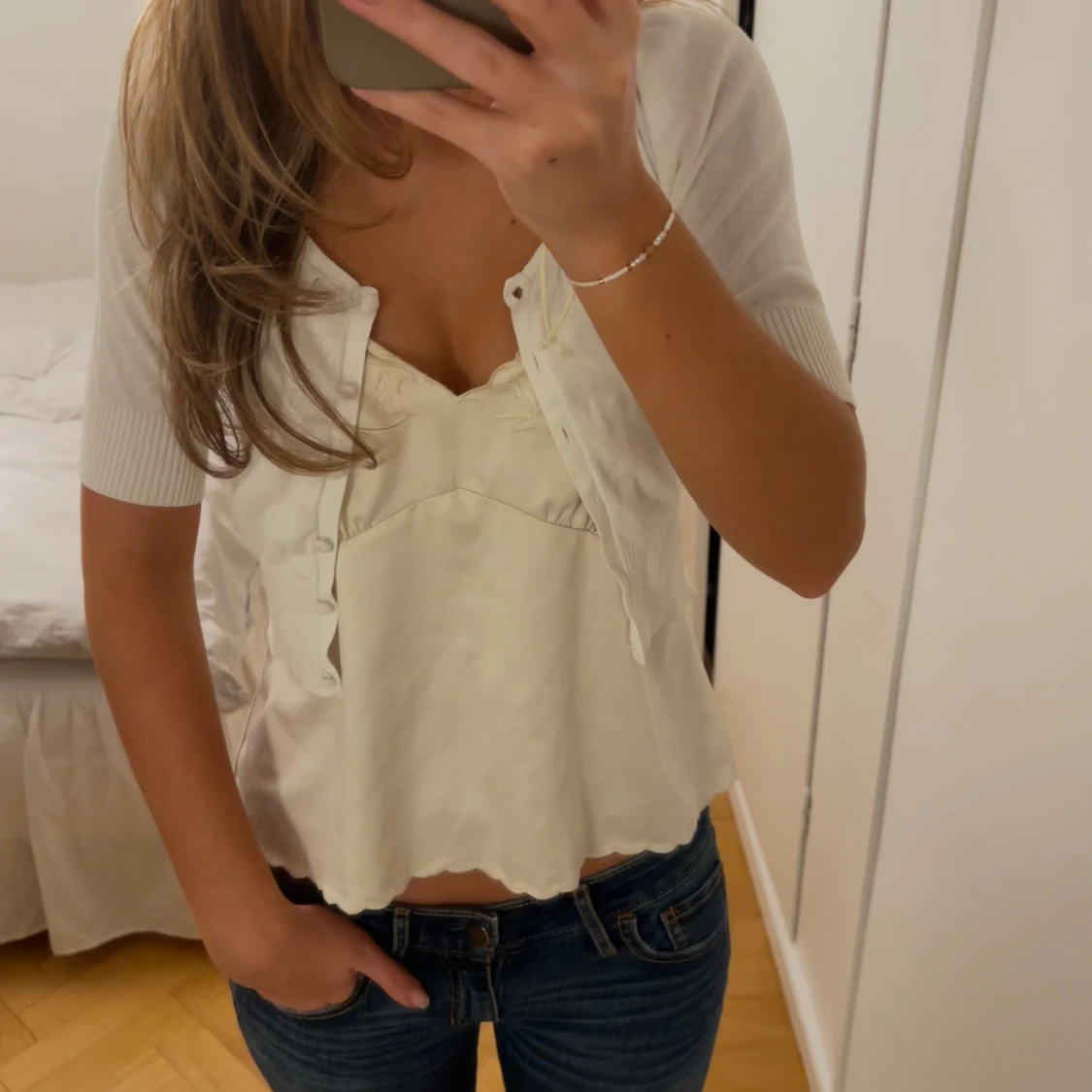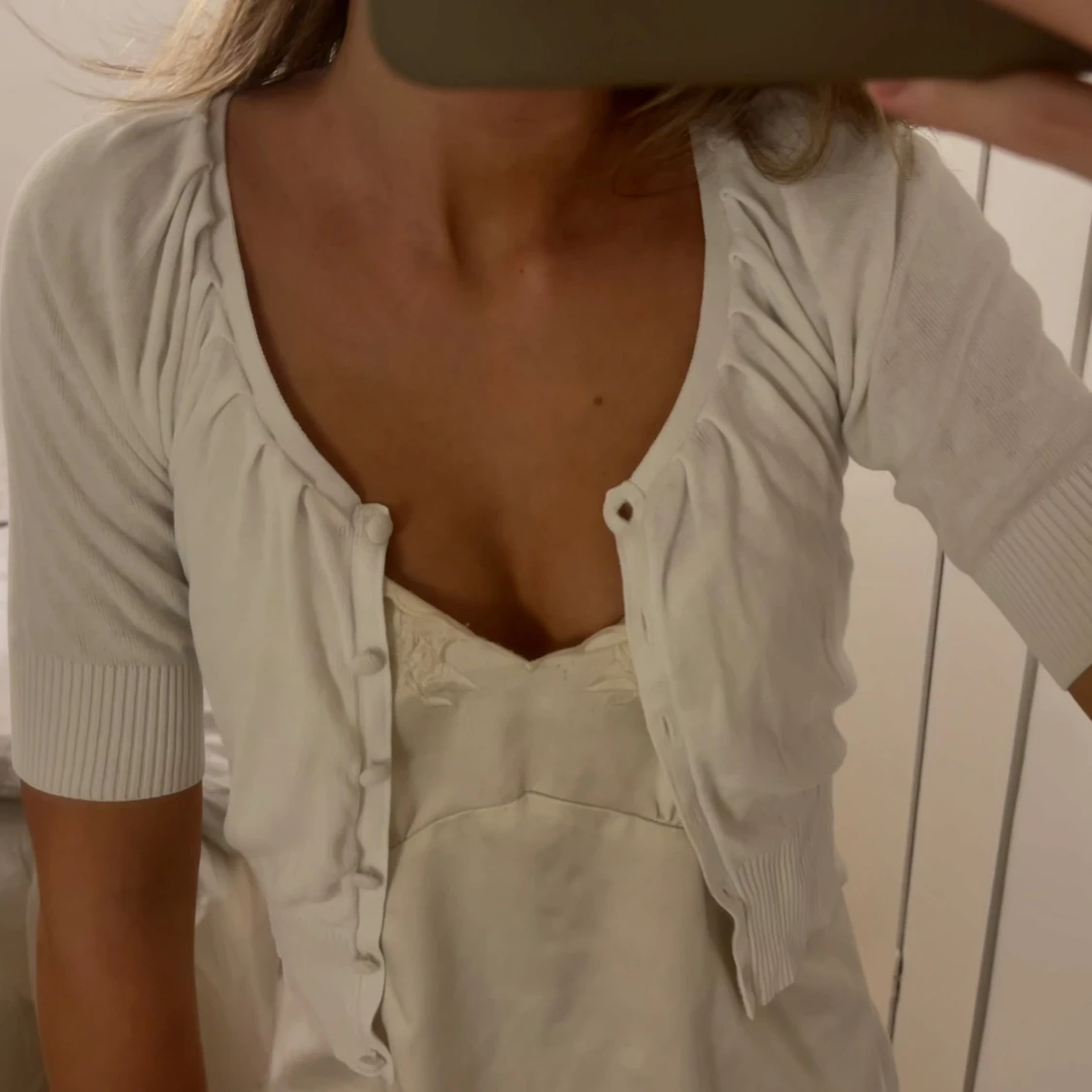 Söt vit bolerotopp med korta ärmar och knappar framtill. Perfekt att bära över ett linne eller klänning💖