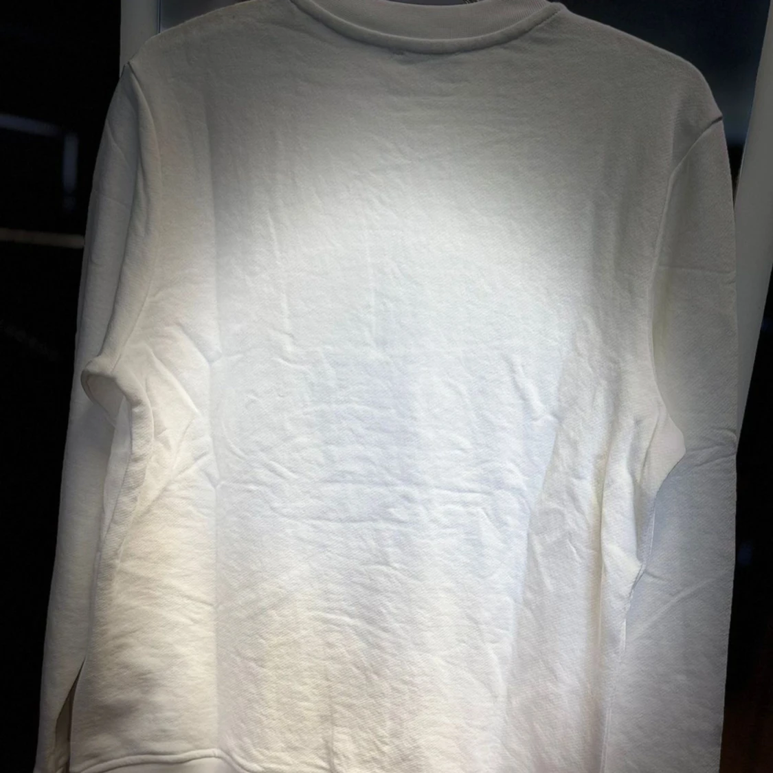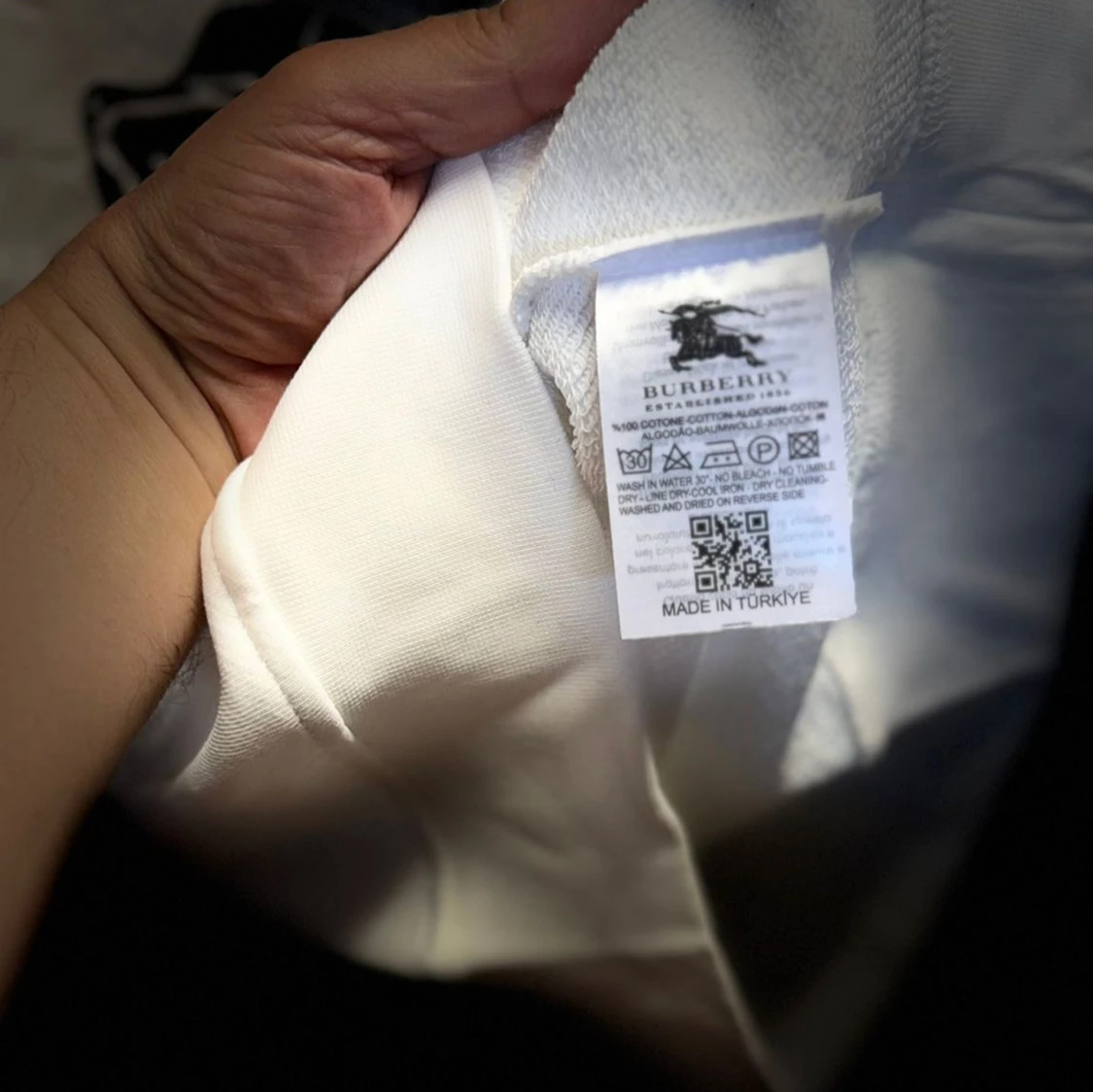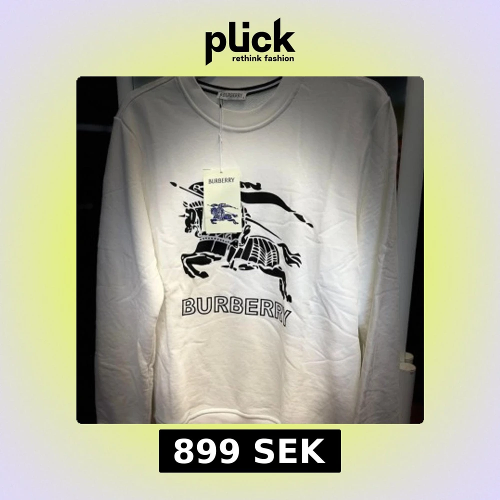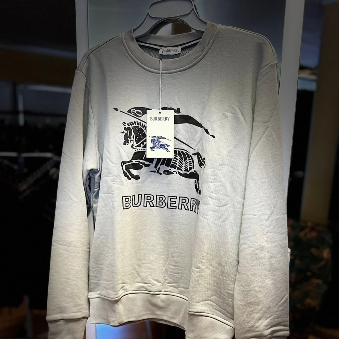 Snygg vit sweatshirt från Burberry med stort svart tryck av riddare och logga framtill. Tröjan har rund hals, långa ärmar och är gjord i mjuk bomull. Perfekt för dig som gillar klassisk stil med en modern twist.