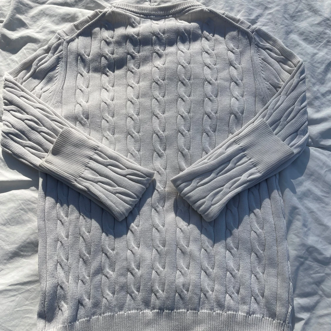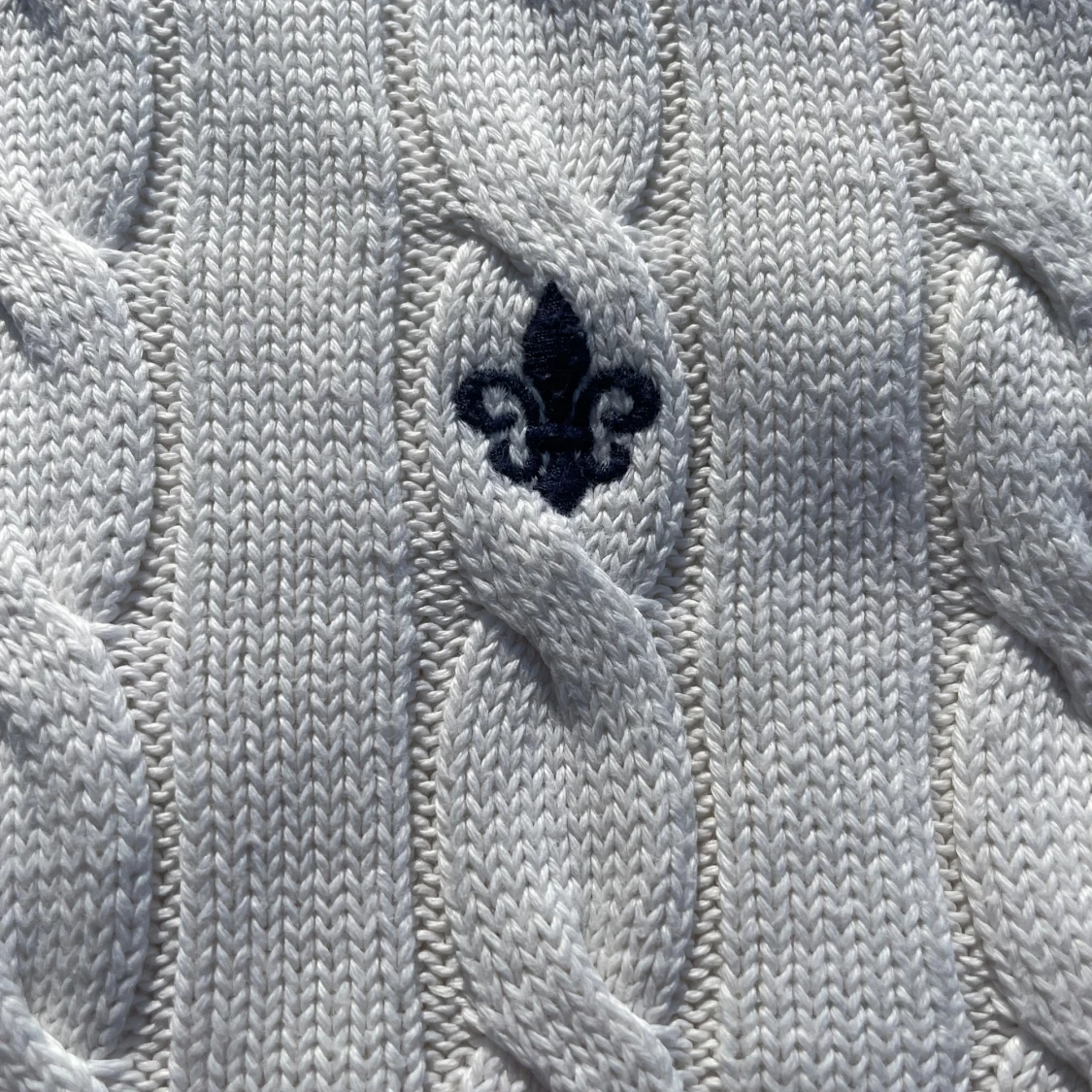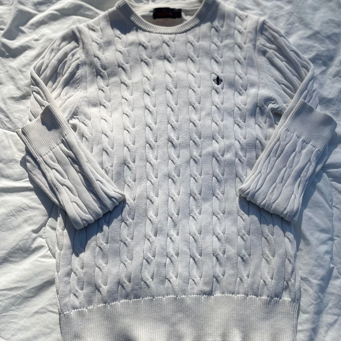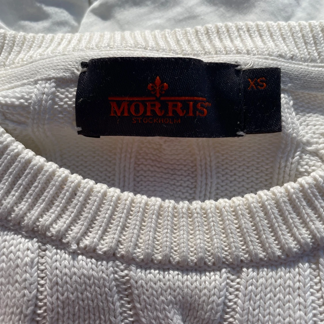 Säljer en stilren vit cabbelstickad tröja från Morris med ett diskret broderat emblem på bröstet. Tröjan har ett klassiskt flätmönster och långa ärmar. Perfekt för en elegant och avslappnad look. Tröjan är i bra skick. Skriv till mig vid frågor eller om du vill ha fler bilder.