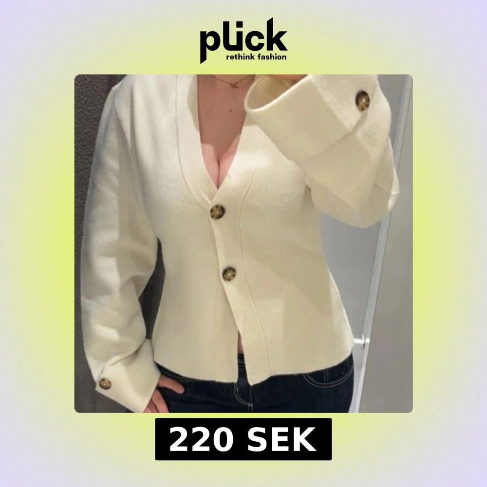 Snygg vit cardigan jacka med stora bruna knappar och v-ringad hals. Jackan har lång ärm med knappdetalj vid ärmslut och en figurnära passform. Perfekt för dig som gillar stilrena och trendiga plagg.