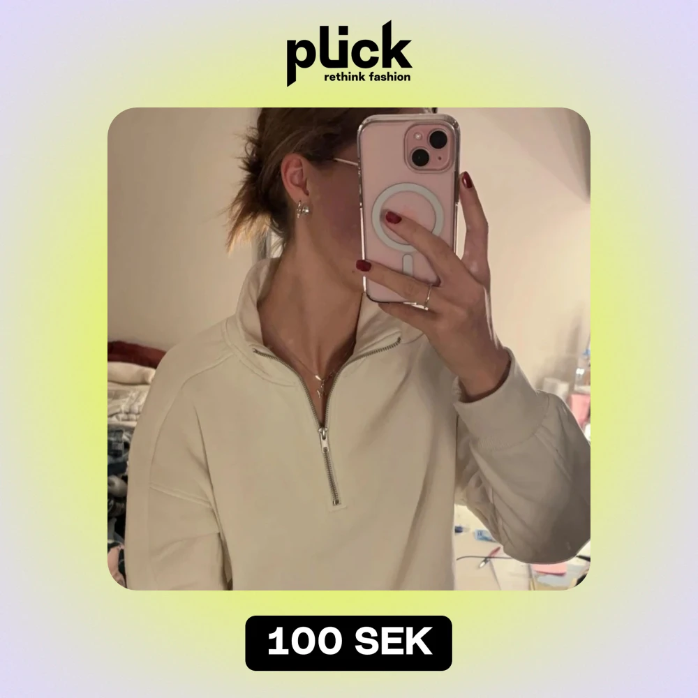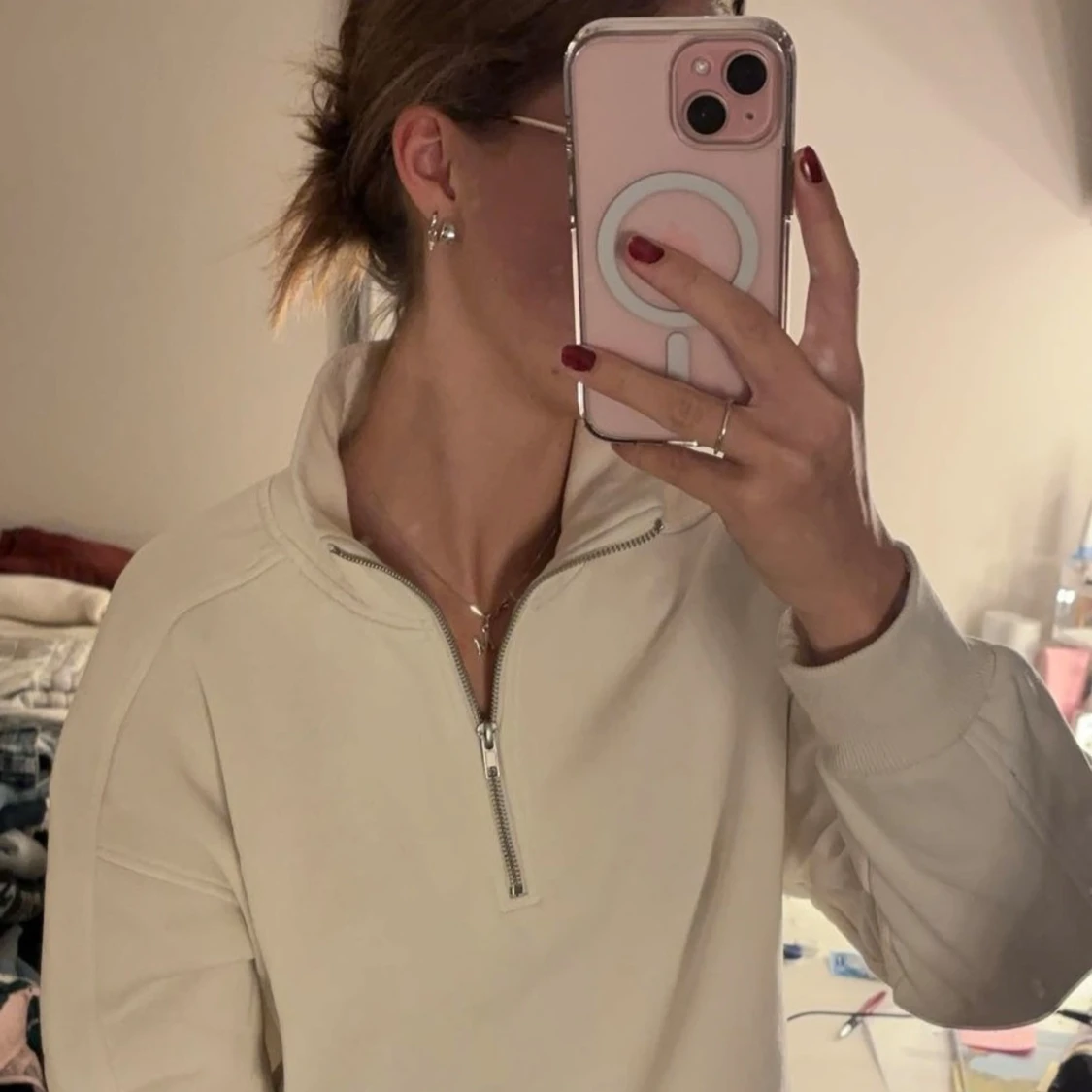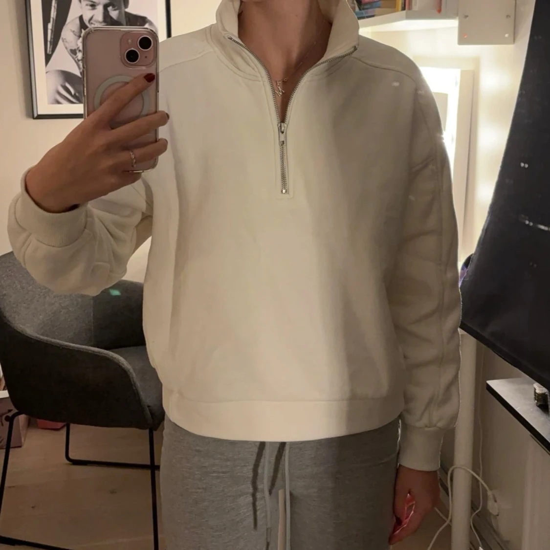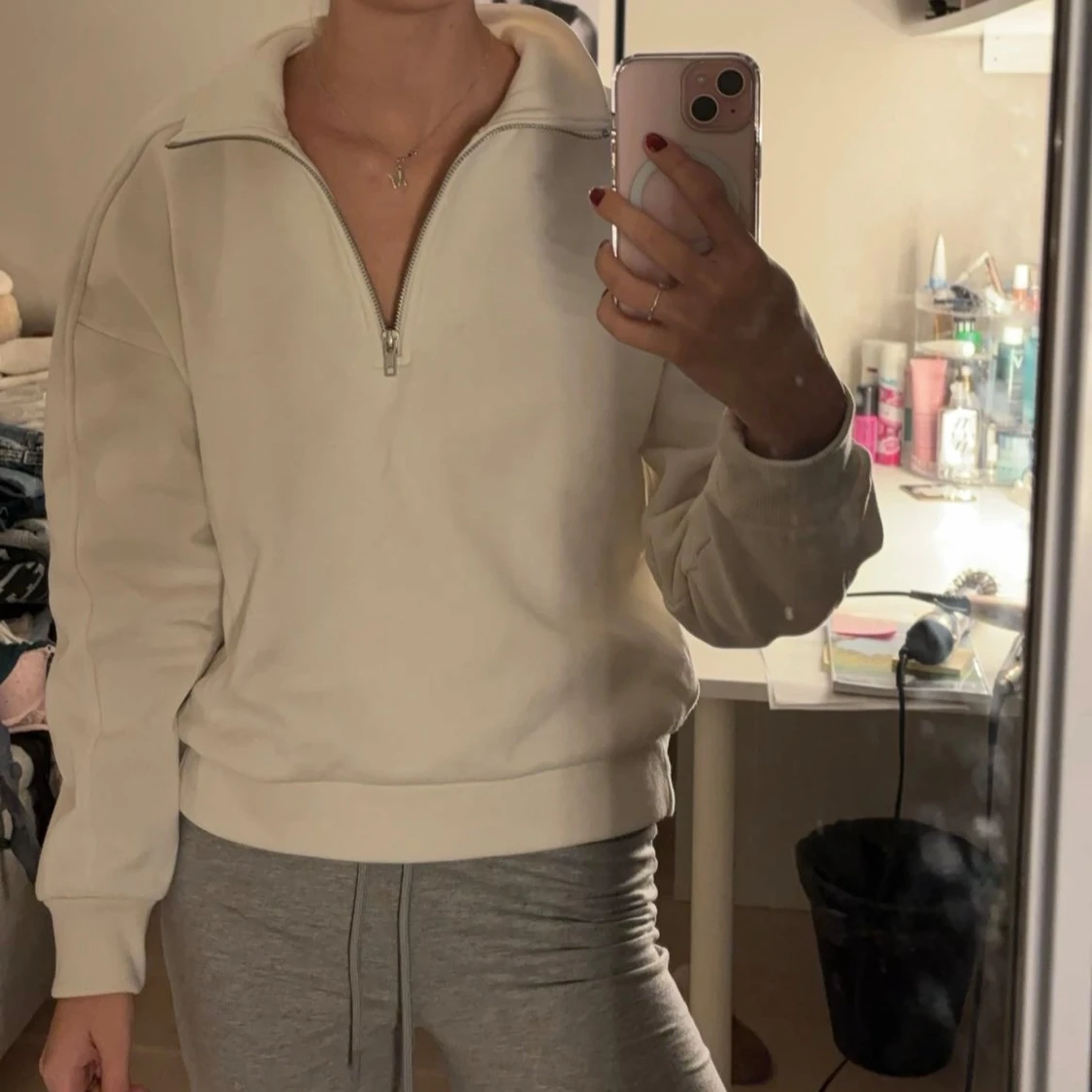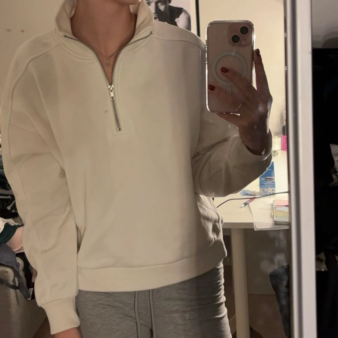 Säljer en supermysig vit/cremefärgad tröja med halv dragkedja. Perfekt för chilliga dagar eller när du bara vill vara bekväm. Den har långa ärmar och en hög krage som du kan justera med dragkedjan. Passar perfekt till både jeans och mjukisbyxor. 🖤