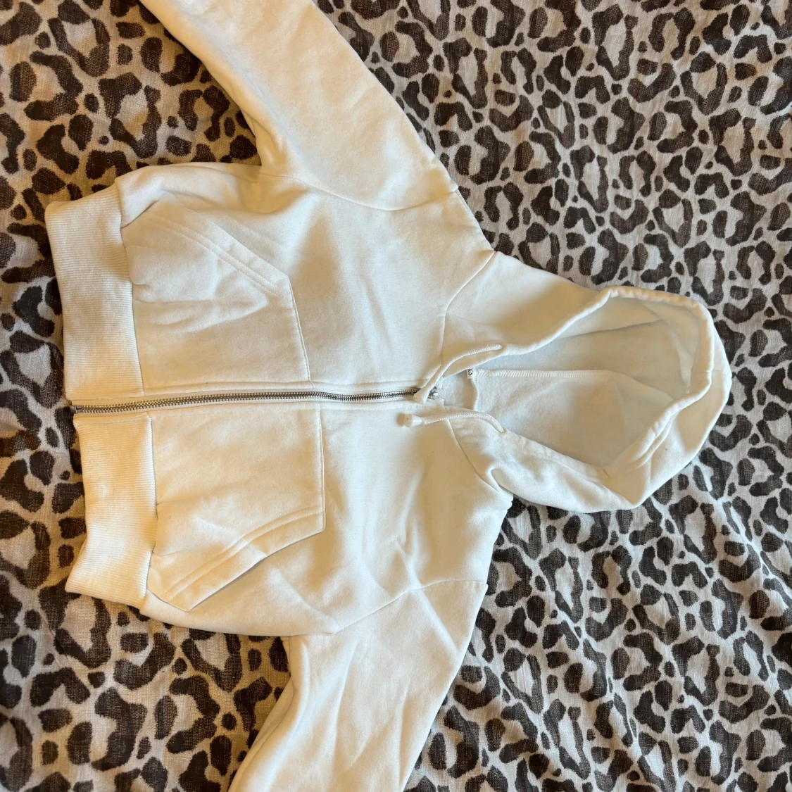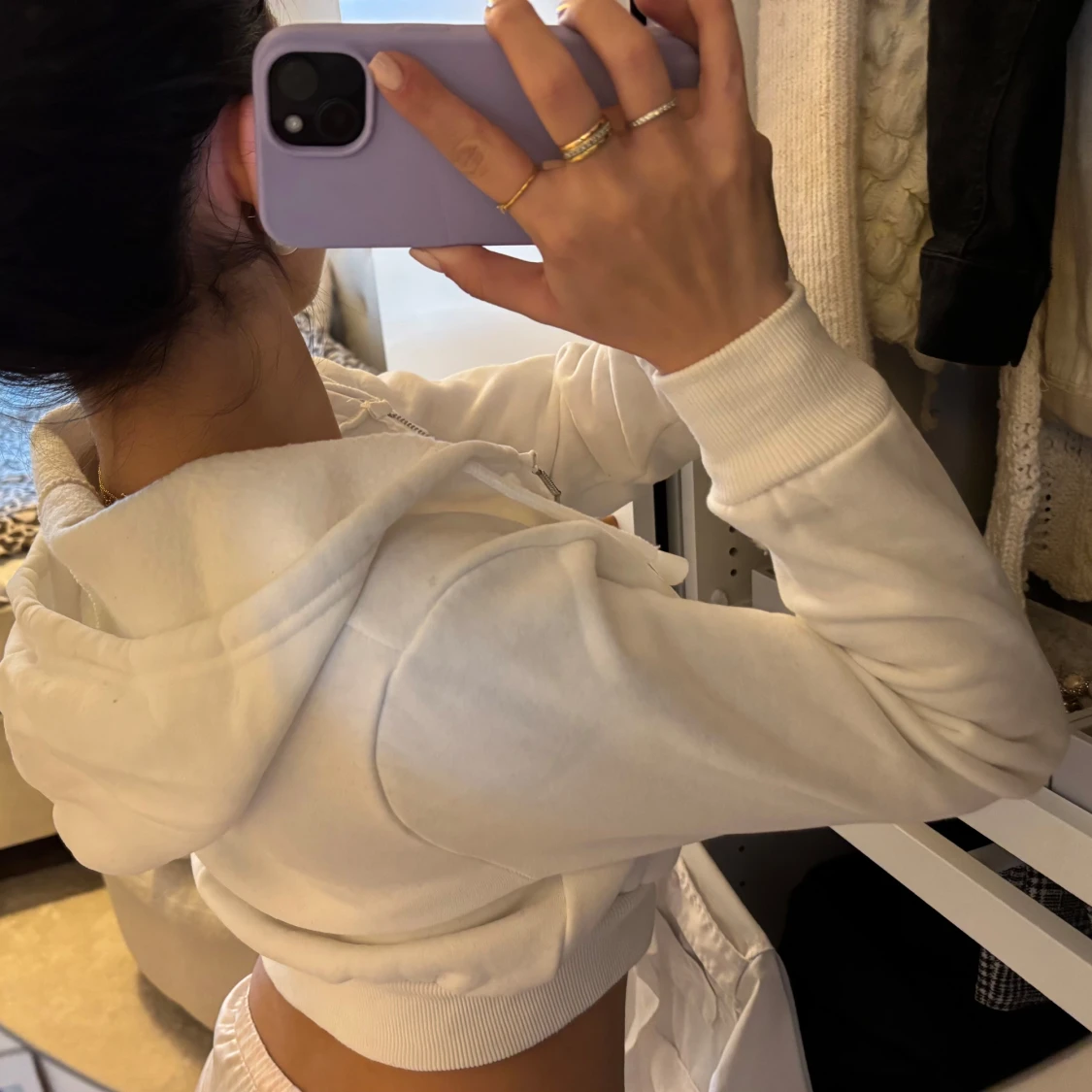 Säljer en snygg vit croppad hoodie med dragkedja och luva. Den har långa ärmar och ribbade muddar vid ärmslut och nederkant. Använt endast en gång.