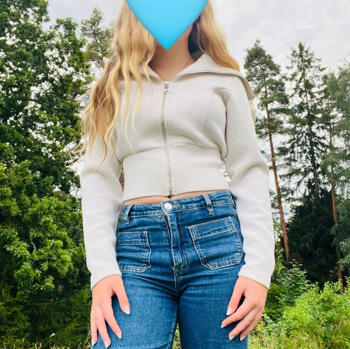 Säljer en stilren vit croppad hoodie med dragkedja. Tröjan har lång ärm och en tightare passform som sitter snyggt på kroppen. Perfekt att matcha med jeans eller kjol för en trendig look.