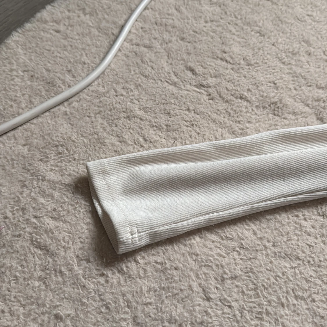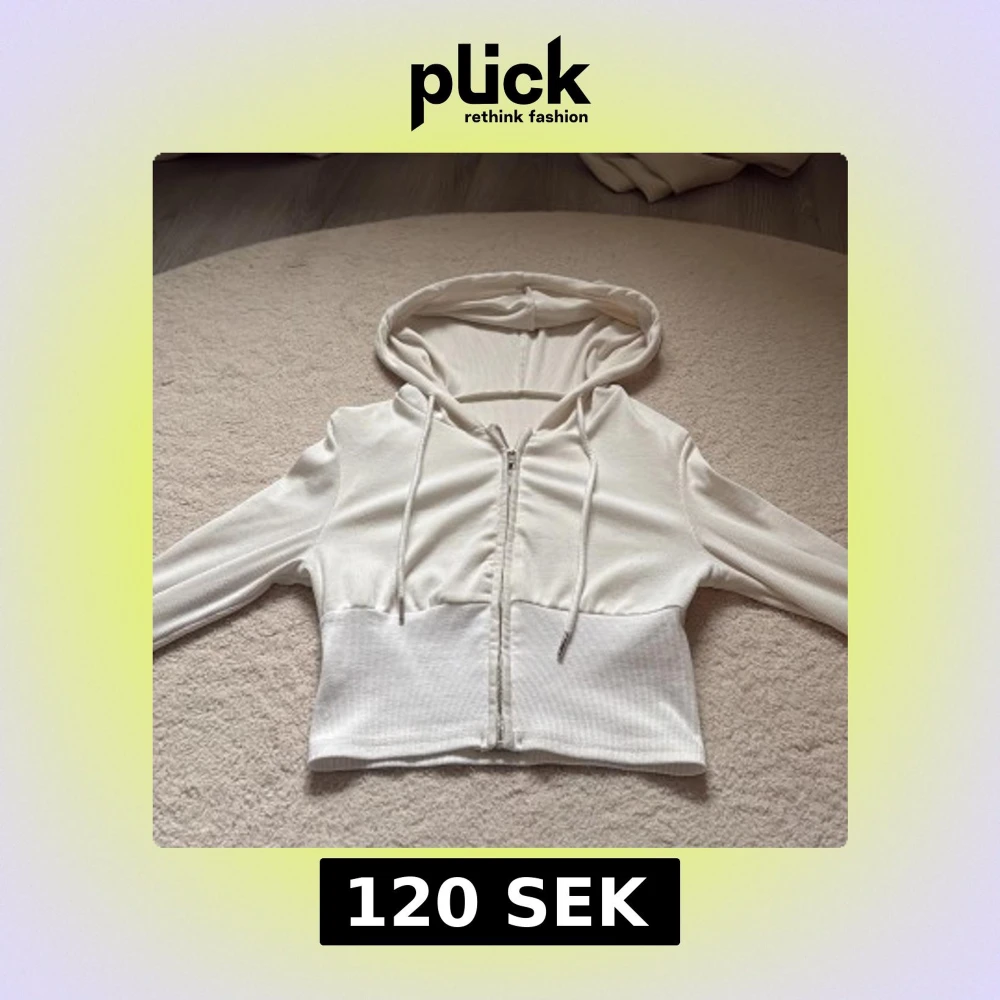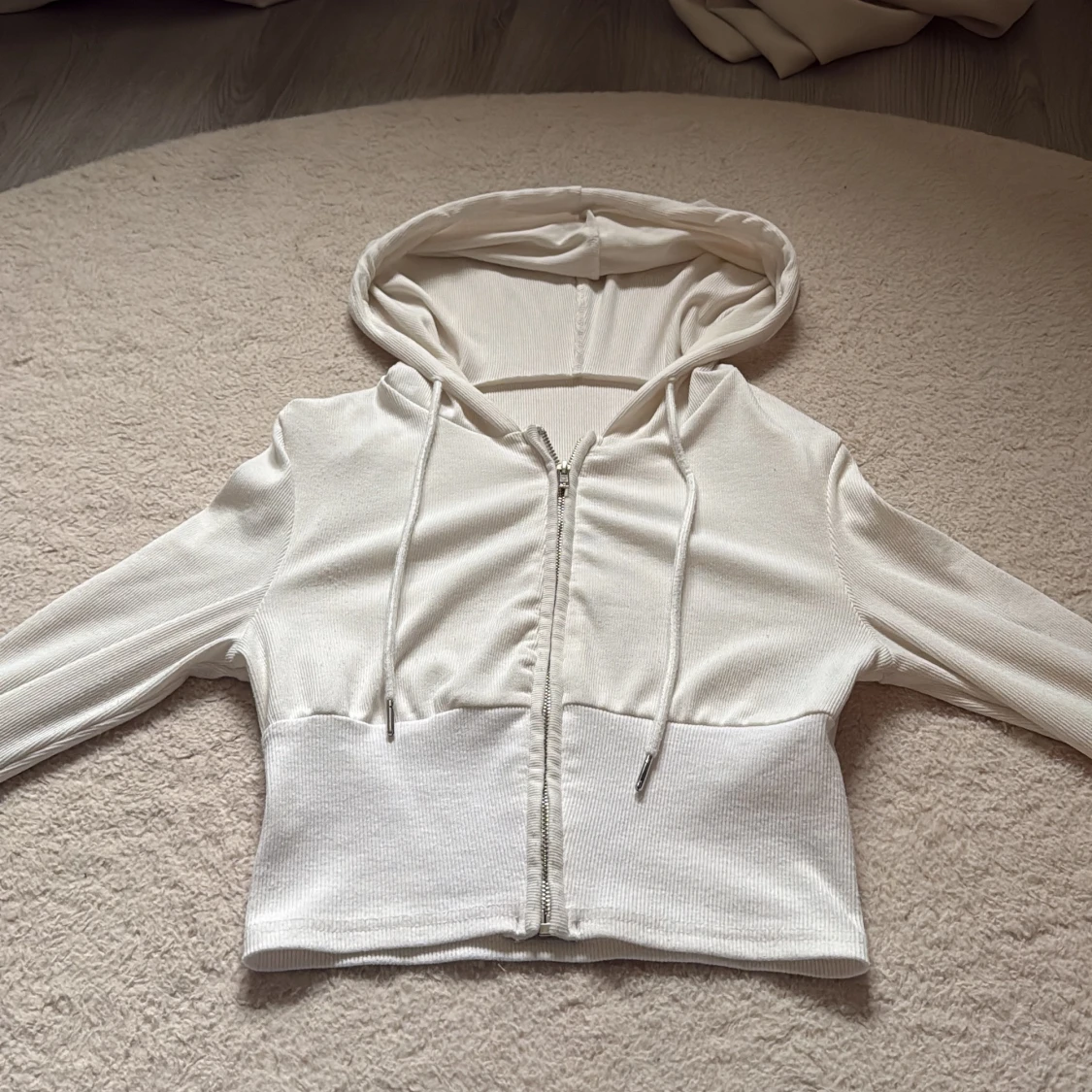 Säljer en vit croppad hoodie med dragkedja framtill och huva. Tröjan har långa ärmar och är tillverkad i ett ribbat, mjukt material som känns skönt mot huden. Perfekt för en chill och stilren look.