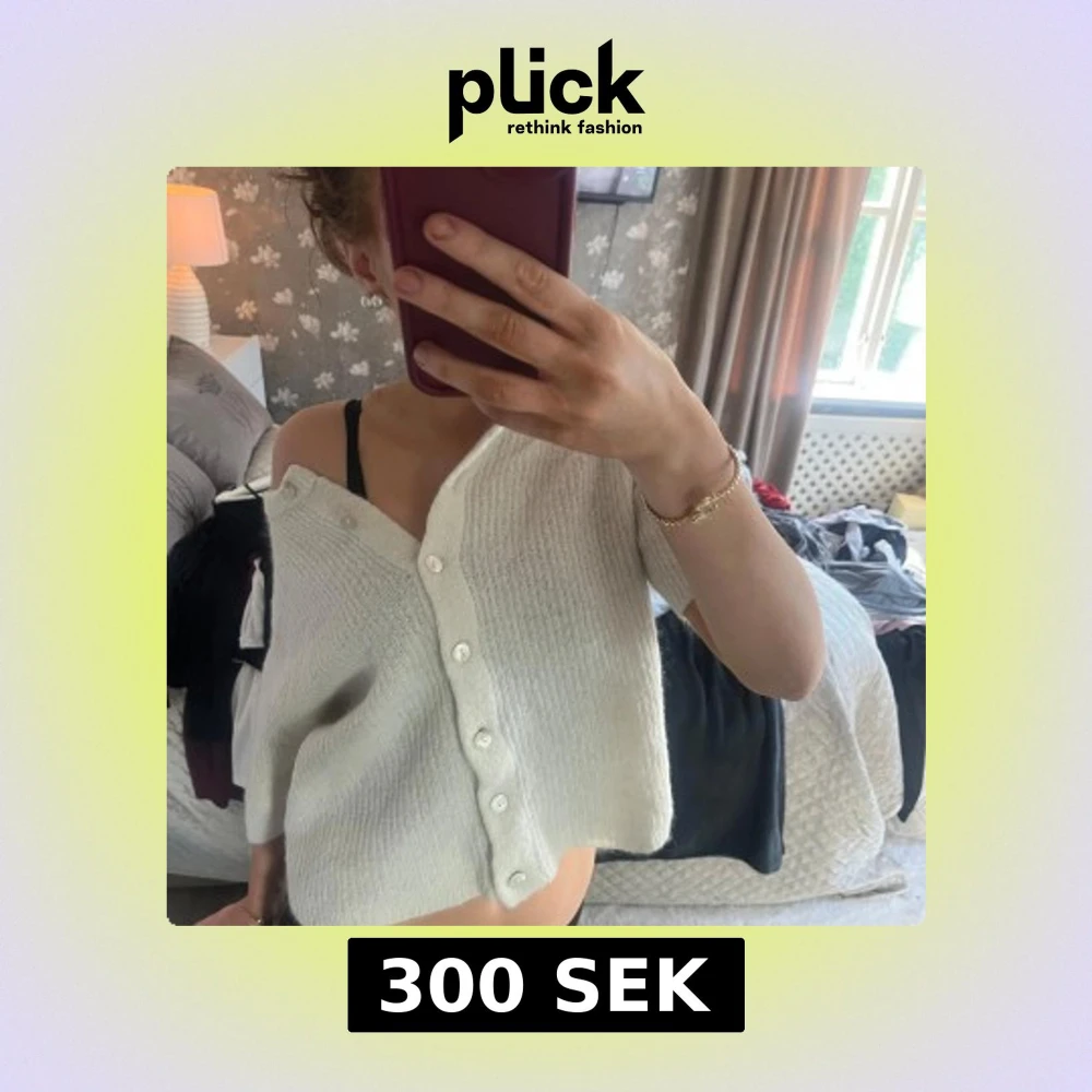 Säljer en vit, croppad kofta med knappar framtill. Tröjan har korta ärmar och är stickad i ett mjukt material. Perfekt för lager-på-lager och enkel att styla till olika outfits.