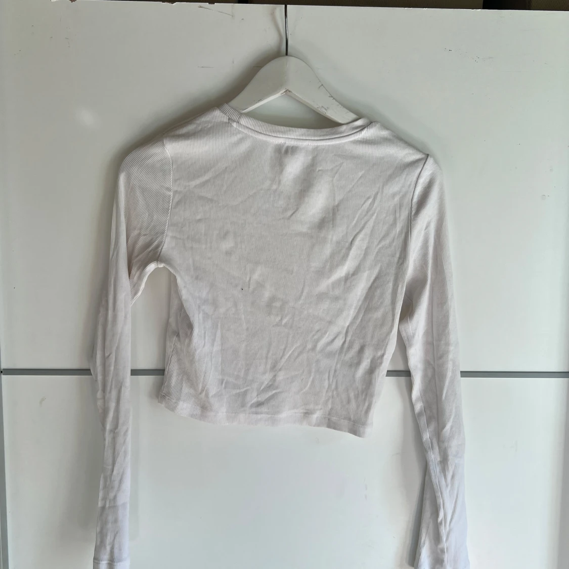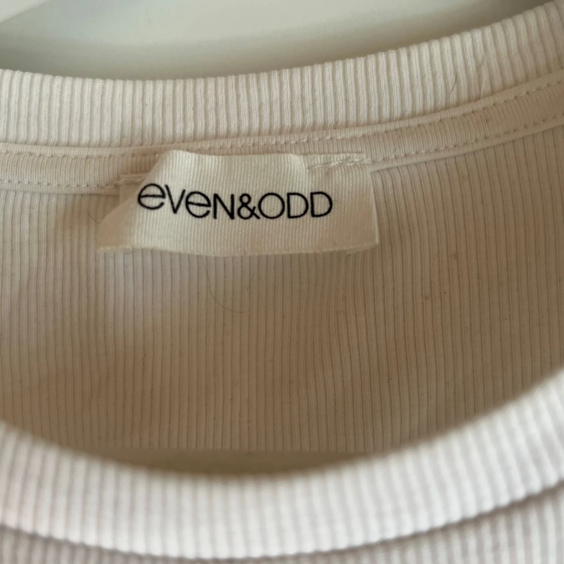 Vit croppad långärmad tröja från Even&Odd. Tröjan är ribbad och har en enkel, stilren design med rund halsringning. Perfekt att matcha med höga jeans eller kjol för en clean look.