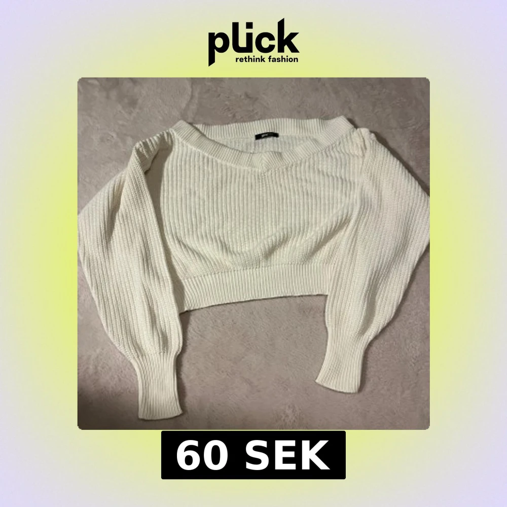Superfin vit croppad stickad tröja från Gina Tricot med bred ribbad struktur och lång ärm. Tröjan har en snygg v-ringning och breda muddar vid ärmslut och nederkant. Perfekt att styla med höga jeans eller kjol.