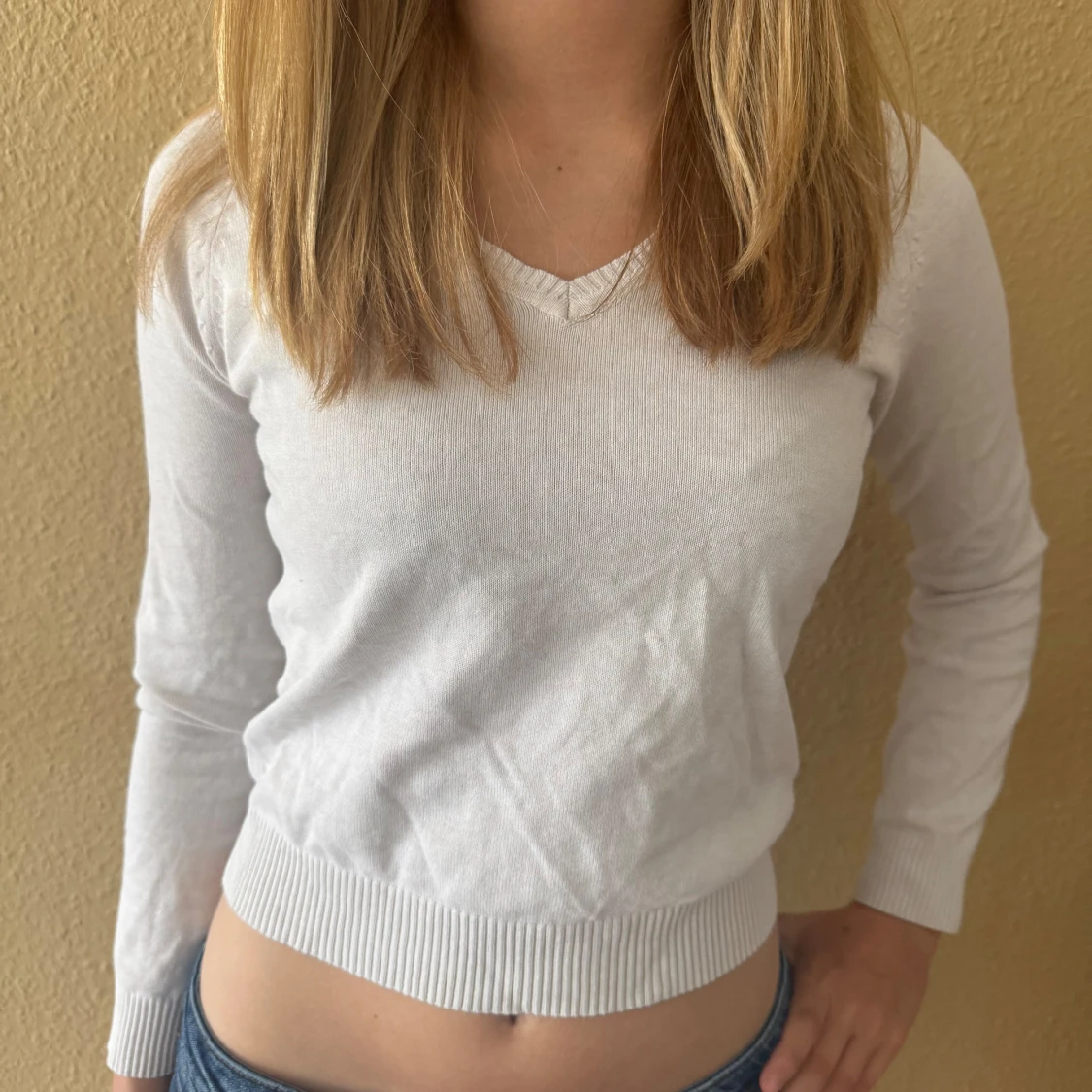 Snygg vit croppad stickad tröja med v-ringning och långa ärmar. Tröjan har ribbade muddar vid ärmslut och nederkant, perfekt för en clean och fräsch look. Enkel att matcha med jeans eller kjol för en stilren outfit.