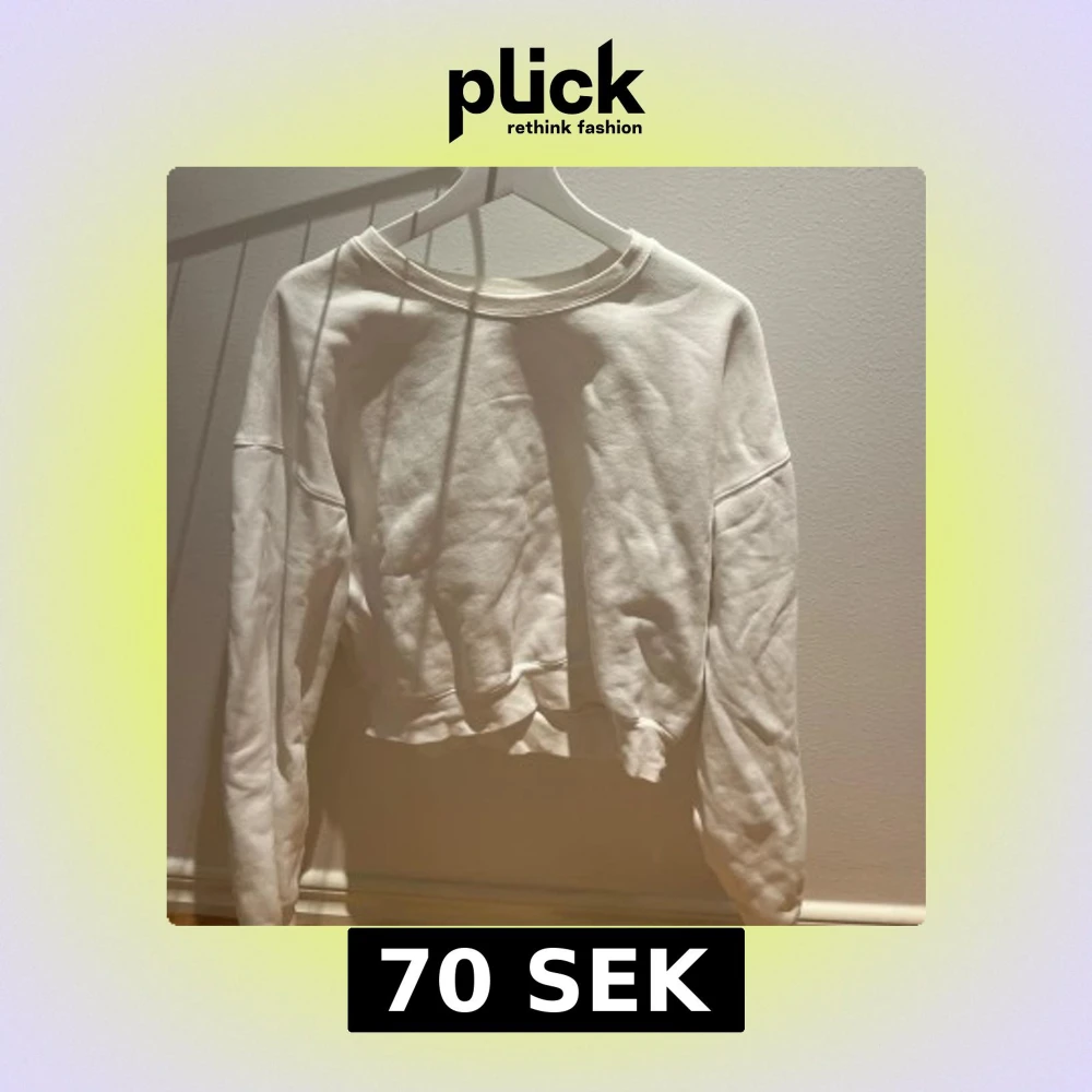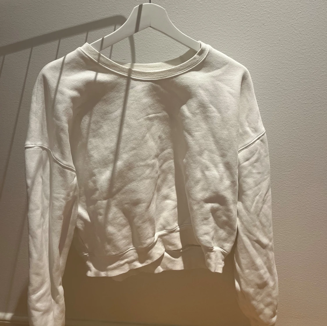 Enkel och stilren vit croppad sweatshirt med rund halsringning och långa ärmar. Tröjan har en avslappnad passform och är tillverkad i mjuk bomull, perfekt för en chill och clean look.