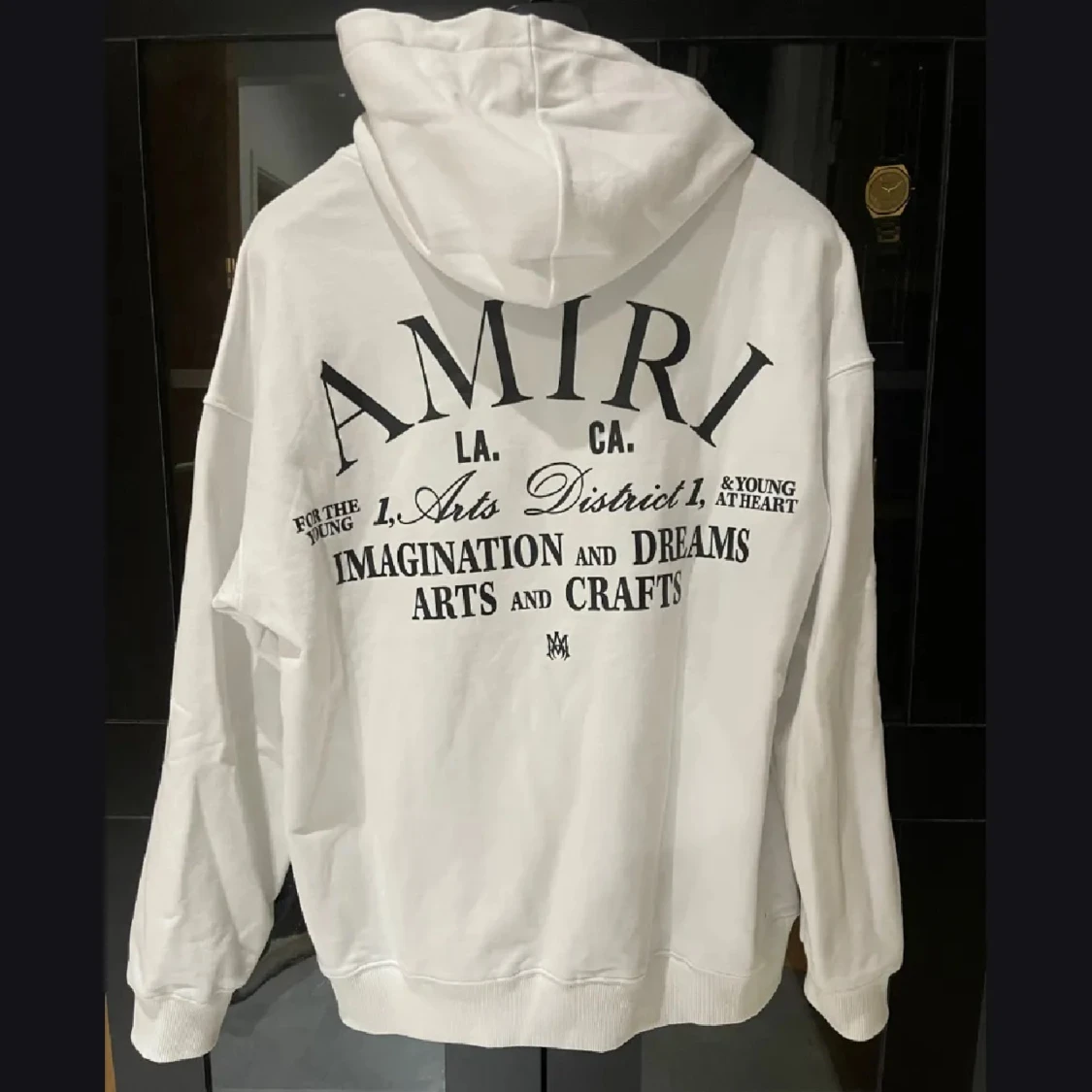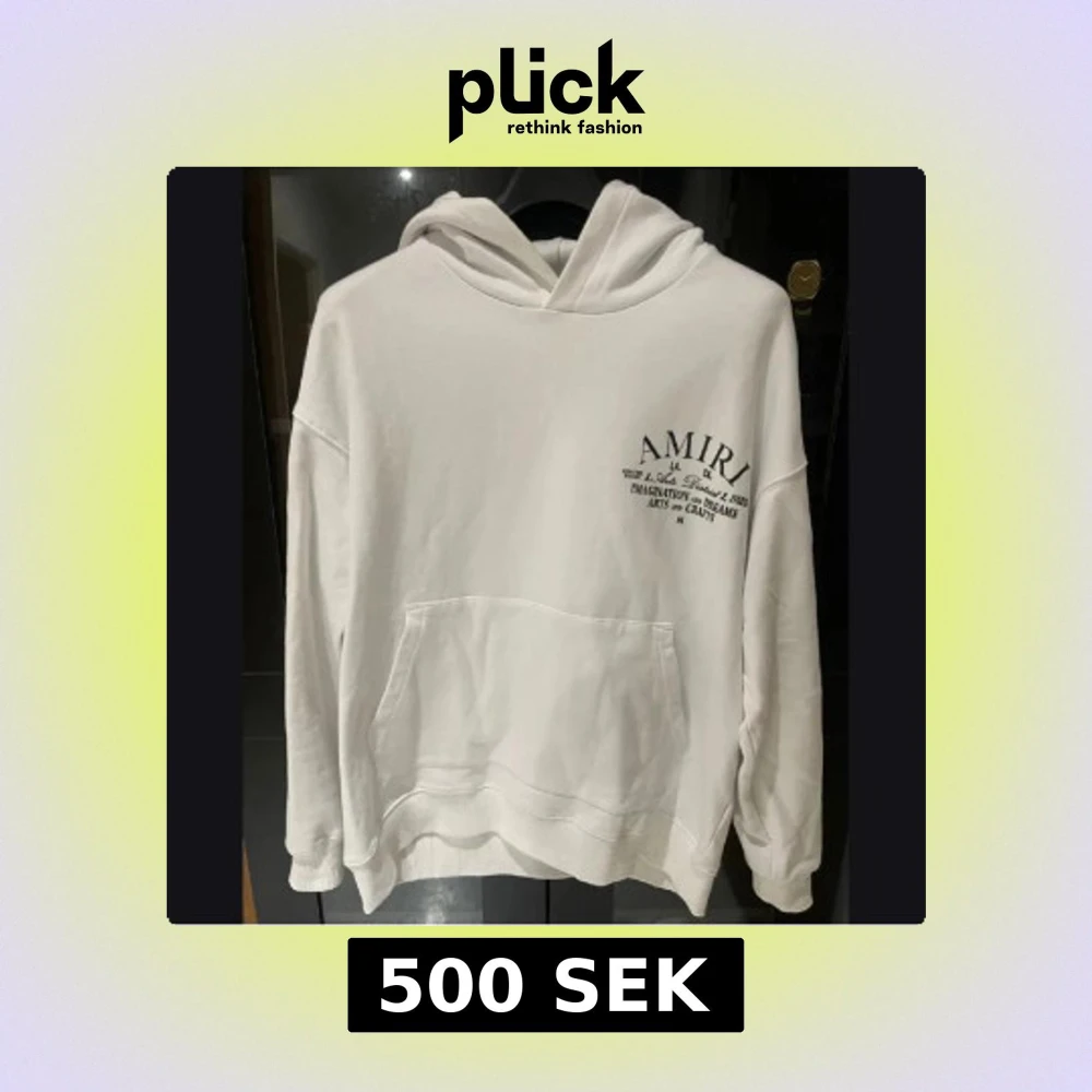 Säljer en stilren vit hoodie från Amiri med tryck både fram och bak. Hoodien har en klassisk design med känguruficka och långa ärmar. Perfekt för en avslappnad look.